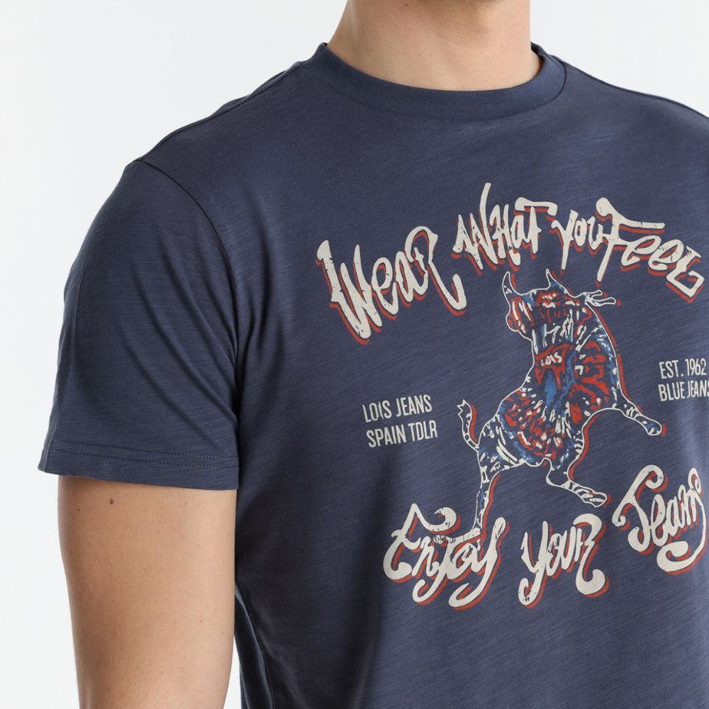 Camiseta de Lois, 100% algodón, en color azul tejano con toro y letras delante