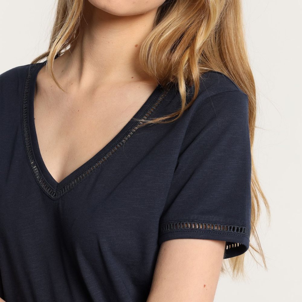 Camiseta de Lois, 100% algodón. con escote pico, en color azul marino con detalle de ganchillo en mangas y escote