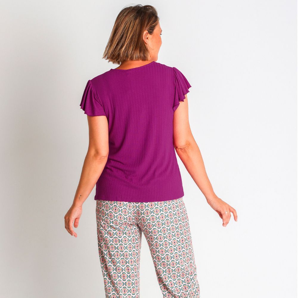 Camiseta de Lourdes Castillo, 94% rayon reciclado 6% spandex, manga volante, canesu fruncido delante, en color buganvilla