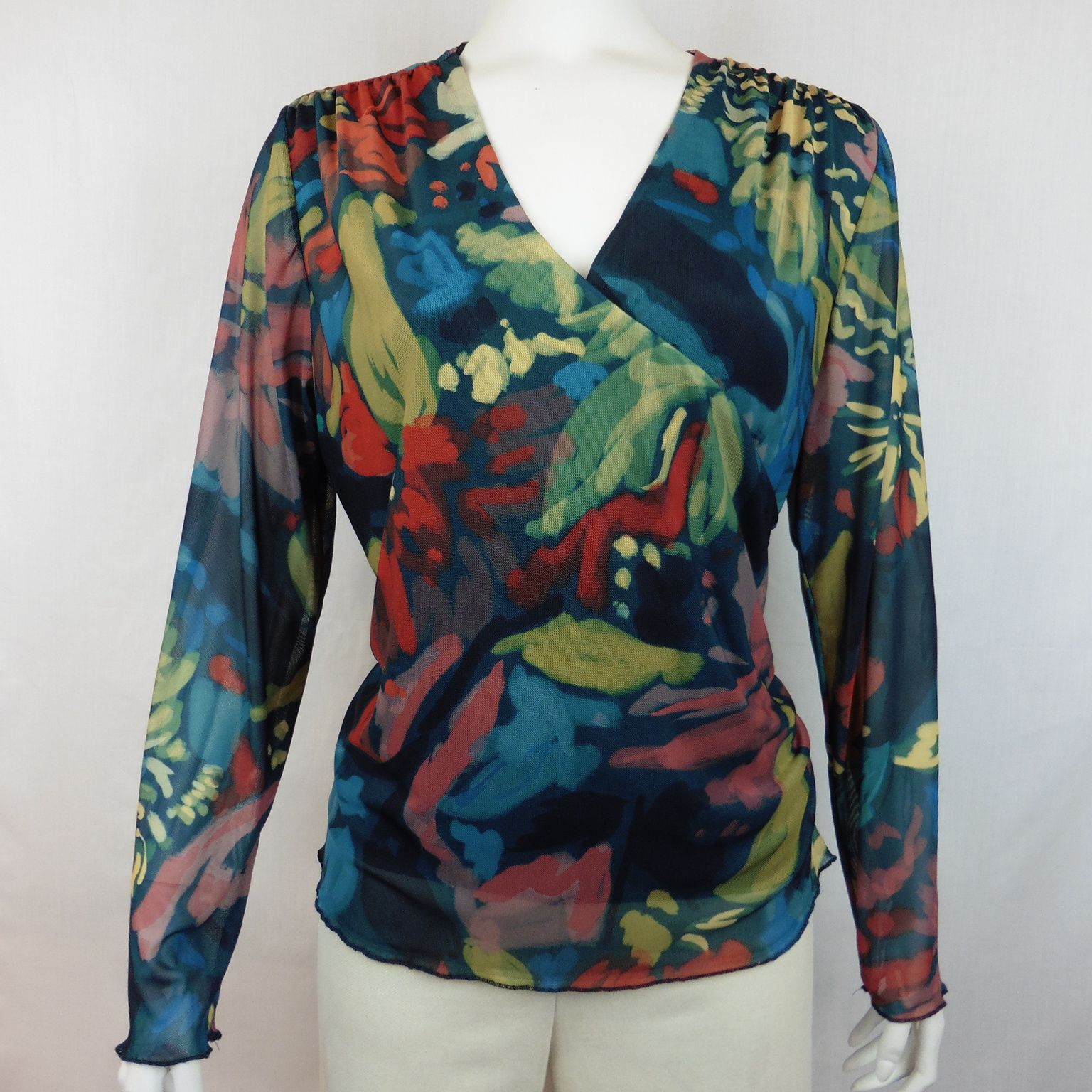 Camiseta de Nayat, 95% poliéster 5% spandex, cuerpo forrado, escote cruzado con drapeado en lateral izquierdo, de tul estampado en tonos amarillo, rojo, verde y azul marino