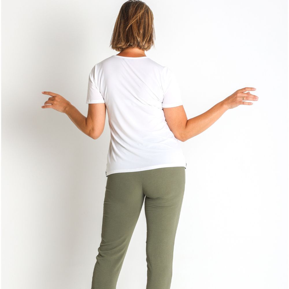 Camiseta de Lourdes Castillo, 95% poliéster reciclado 5% elastano, con manga corta, en color blanco con dibujo verde y negro, letras negras, bajo delantero con dos piezas de tela lisa y estampada en tonos verdes