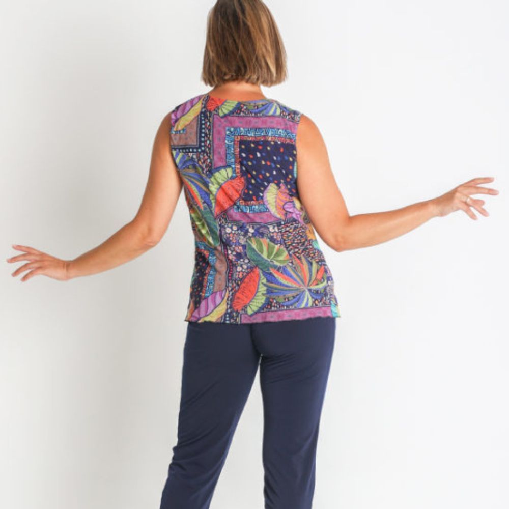Camiseta de Lourdes Castillo, 51% poliéster reciclado 44% poliéster 5% spandex, de tul en color azul marino con estampado multi color, sin mangas, escote redondo con adorno y pliege