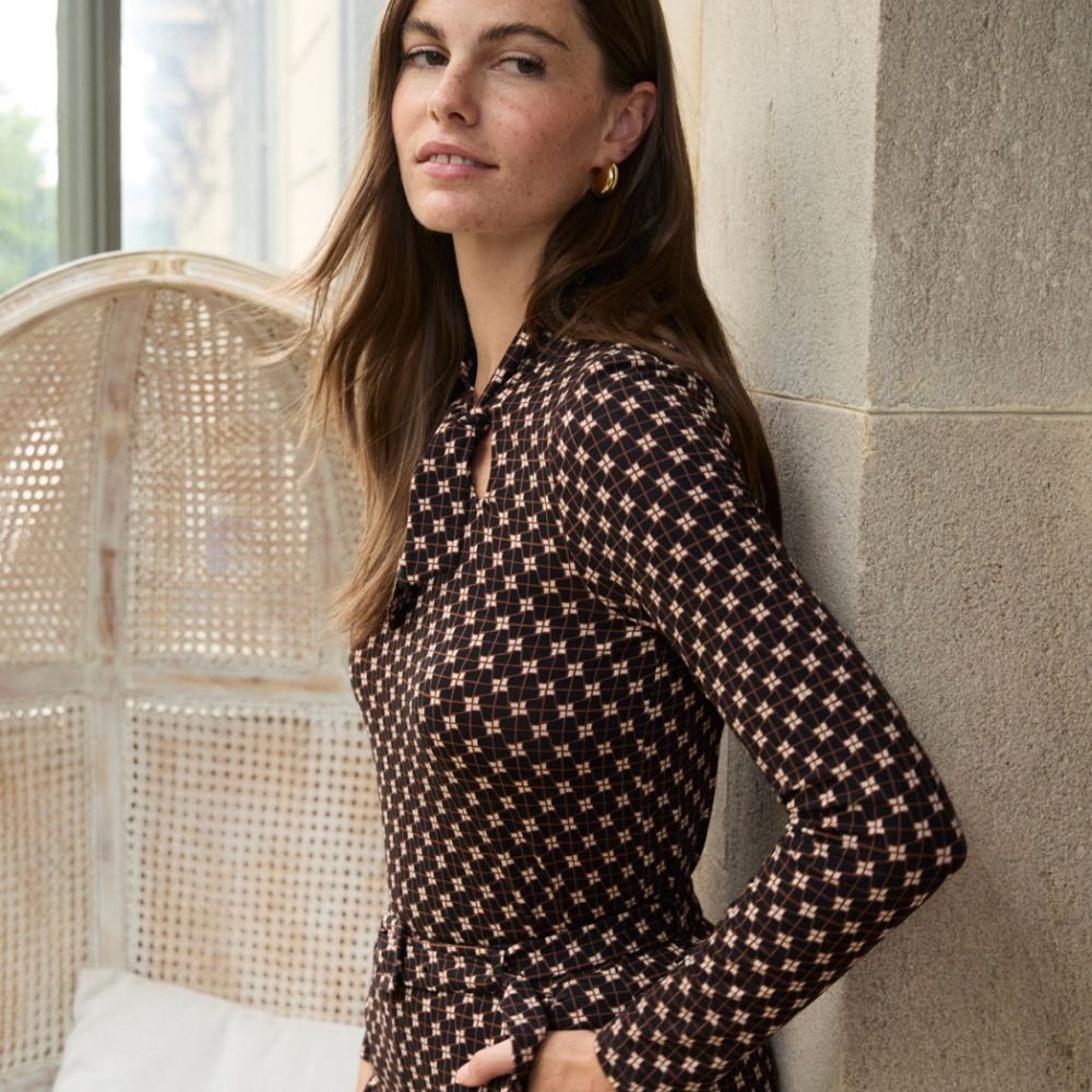 Camiseta de Surkana, 95% viscosa ecovero 5% elastano, cuello semi cisne anudado, estampado geométrico en tonos negro, marrón y crudo