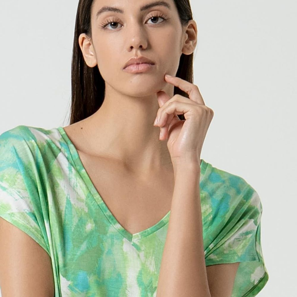 Camiseta de Surkana, 100% lyocell, oversize con manga caída y escote pico, con estampado de pinceladas en tonos verdes y blanco