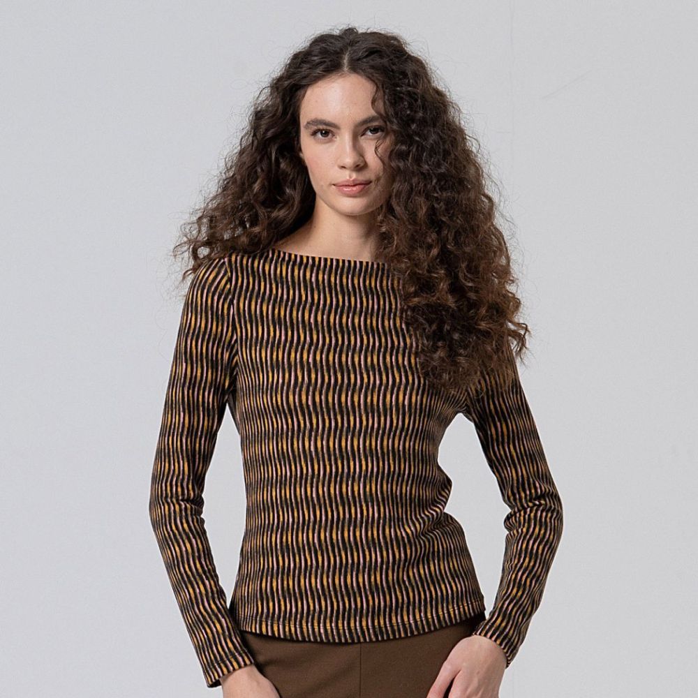 Camiseta de Surkana, 50% poliéster reciclado 45% poliéster 5% elastano, de punto de cálido, escote barca, con estampado vertical en tonos negro, mostaza y rosa
