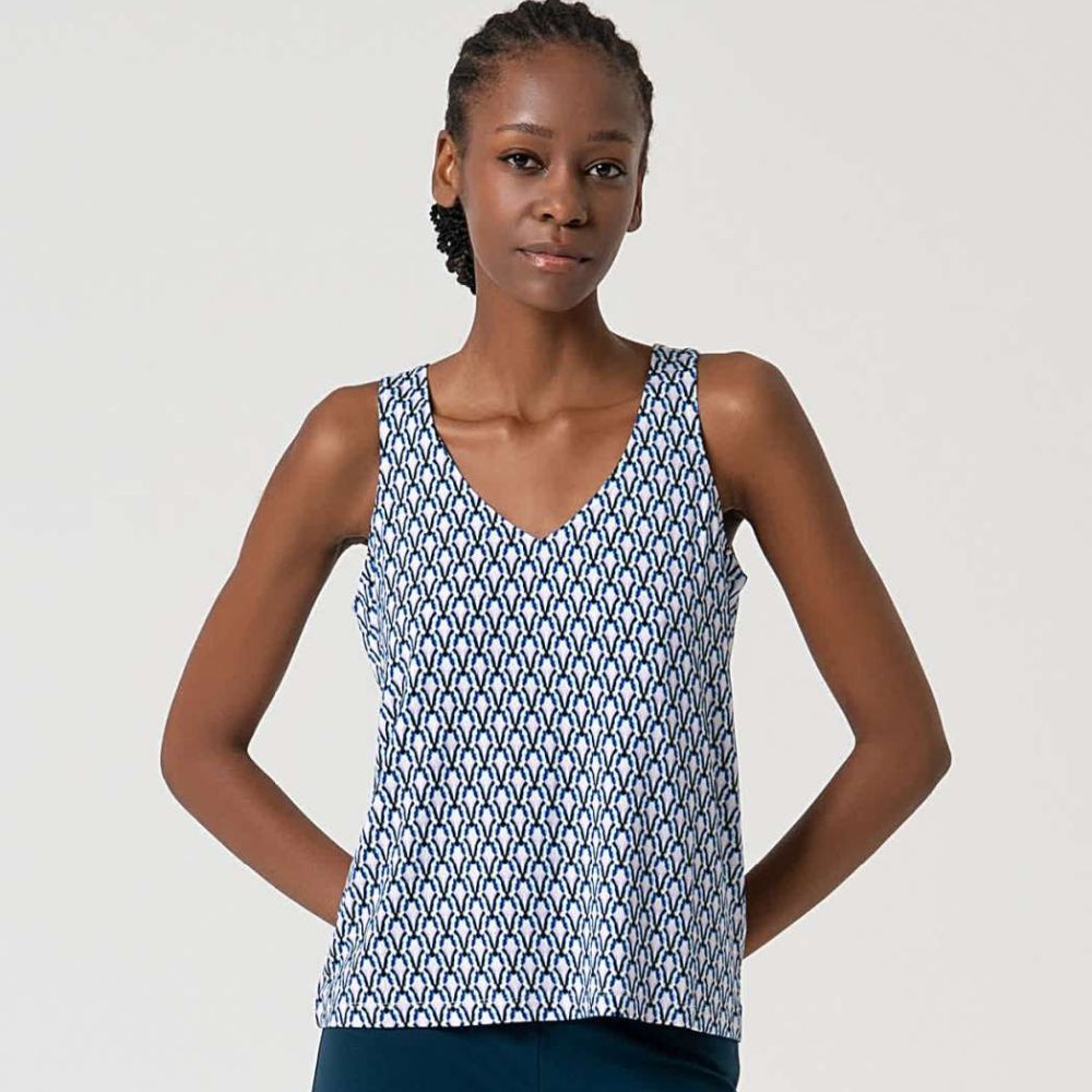 Camiseta de Surkana, 95% viscosa aloe vera modal 5% elastano, con tirantes anchos, escote pico, estampado en tonos azul y rosa