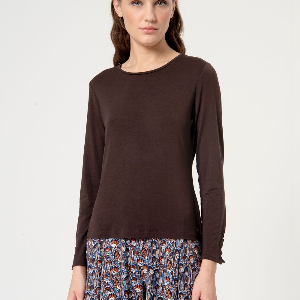 Camiseta de Surkana, 95% viscosa de bambú 5% elastano, corte en los puños con dos botones, entallada con escote redondo, en color marrón