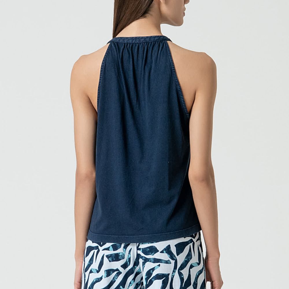 Camiseta de Surkana, 100% algodón orgánico, con cuello halter y escote pico con adorno a ganchillo, en color azul tinta