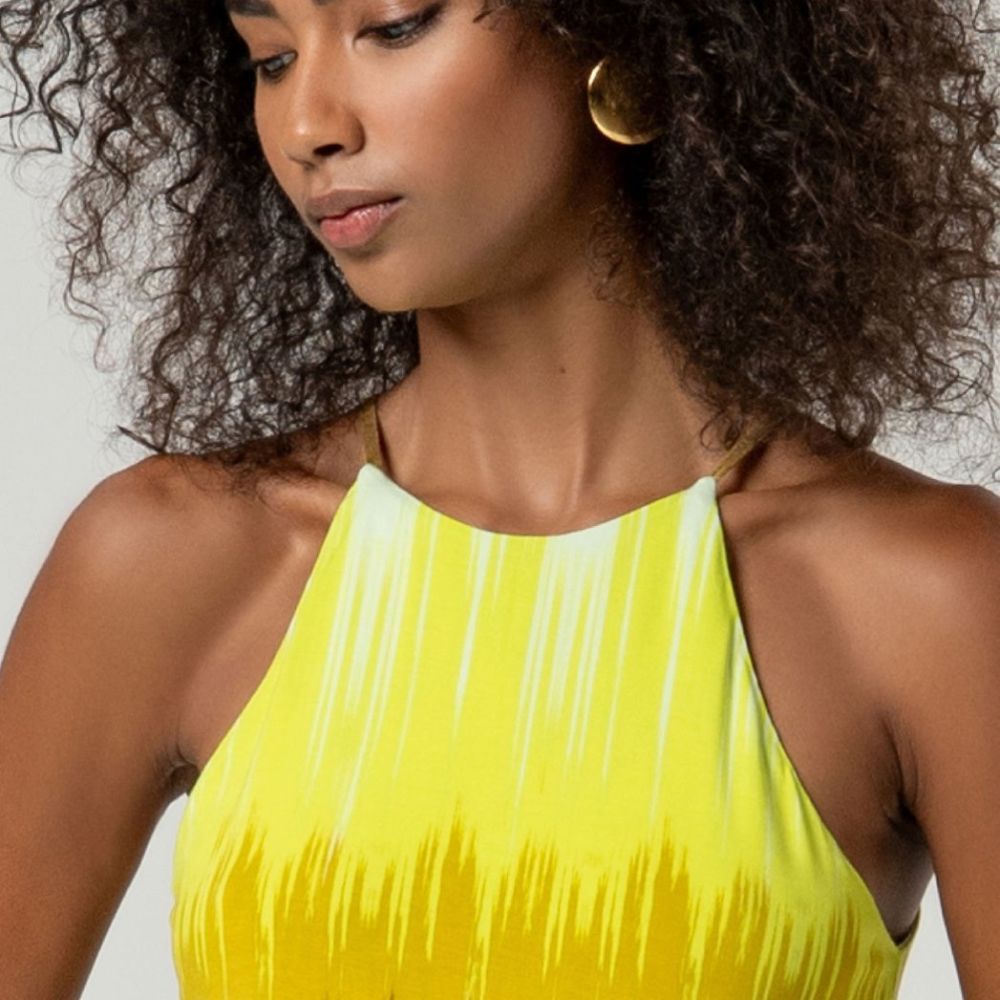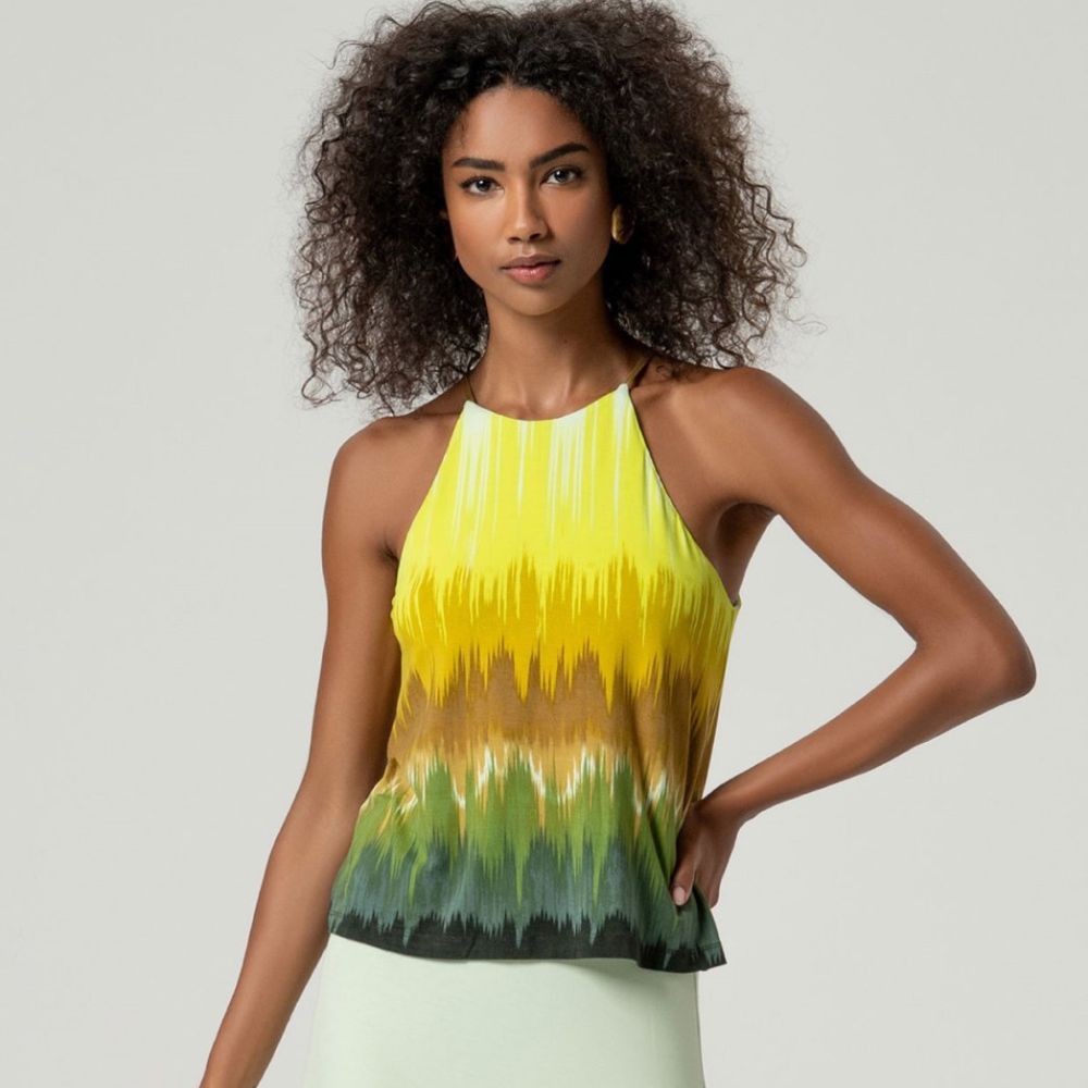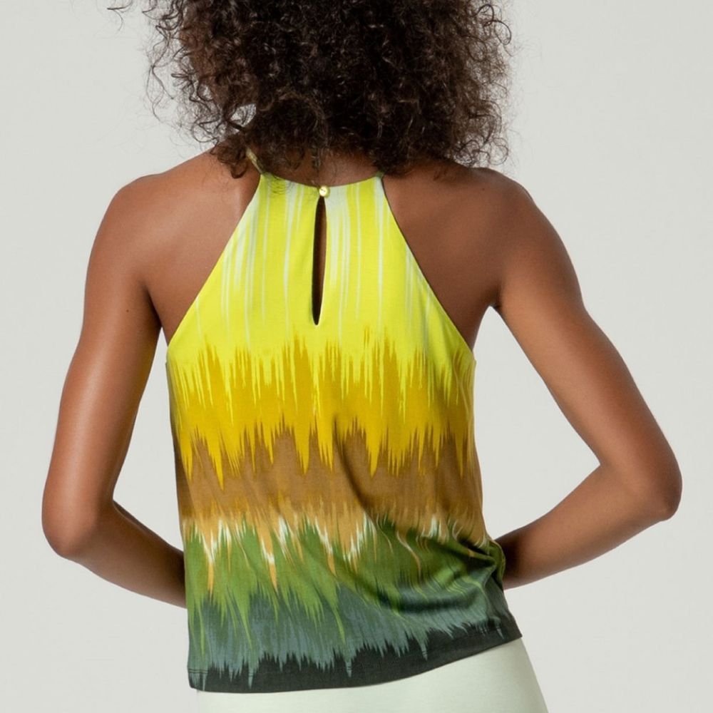 Camiseta de Surkana, 95% viscosa aloe vera modal 5% elastano, con dibujo vertical en tonos lima, verdes y marrones, de tirantes finos al cuello con botón detrás