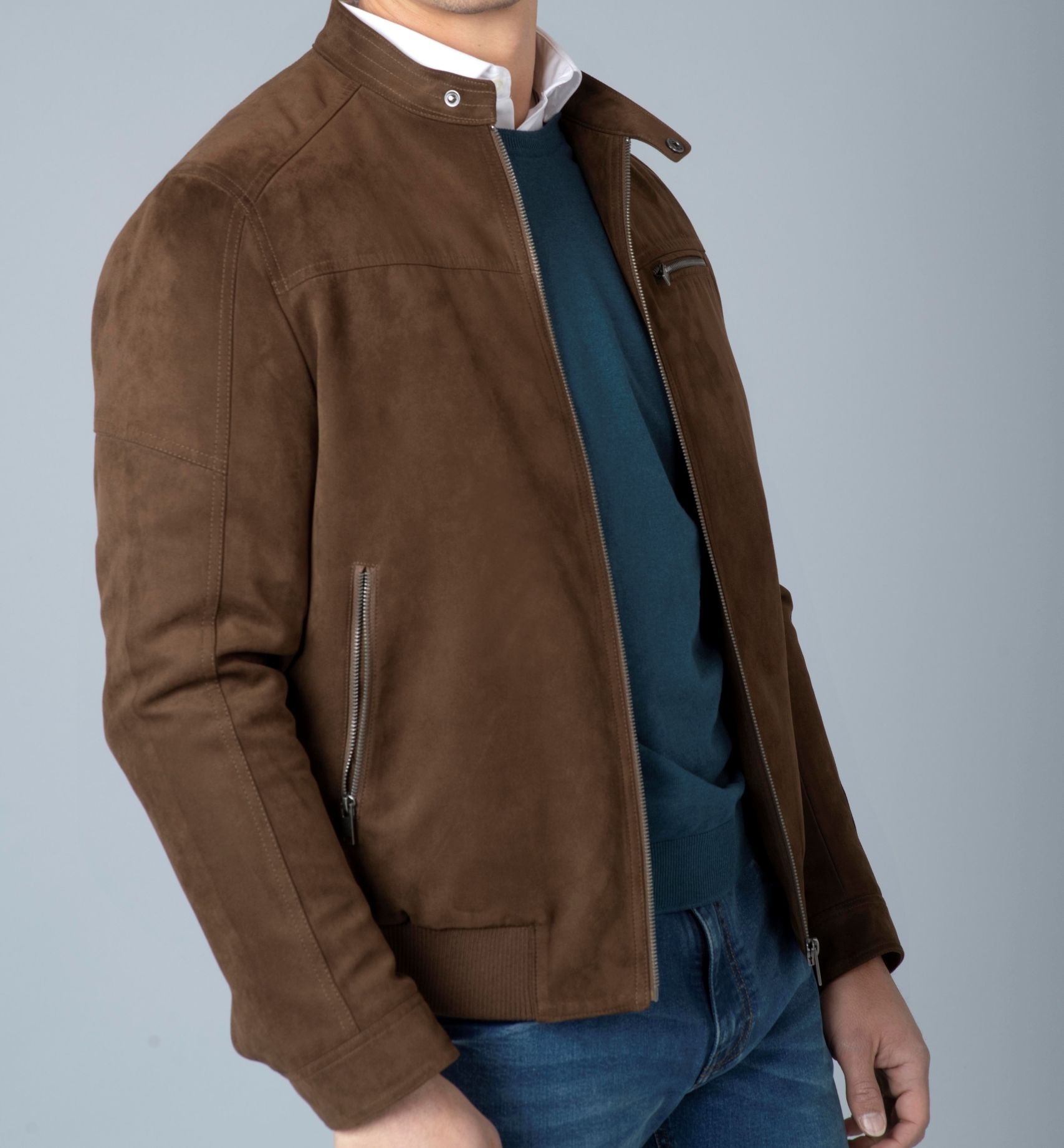 Cazadora de antelina de Alexander & Co., 100% poliéster, cuello de tira  con reloj, 3 bolsillos con cremallera delante y 1 interior, goma en el bajo,  puños con clecks, en color marrón