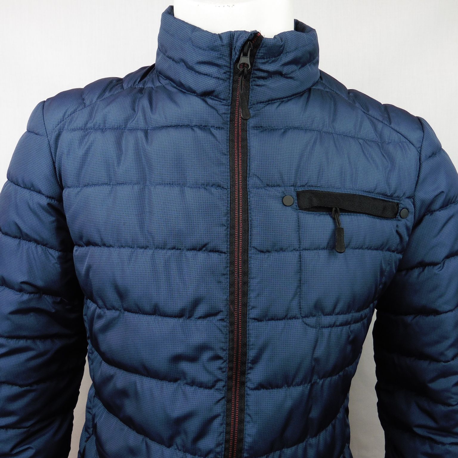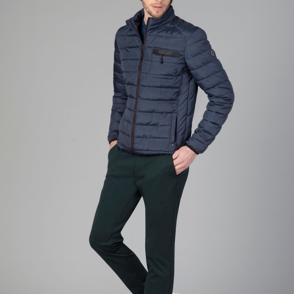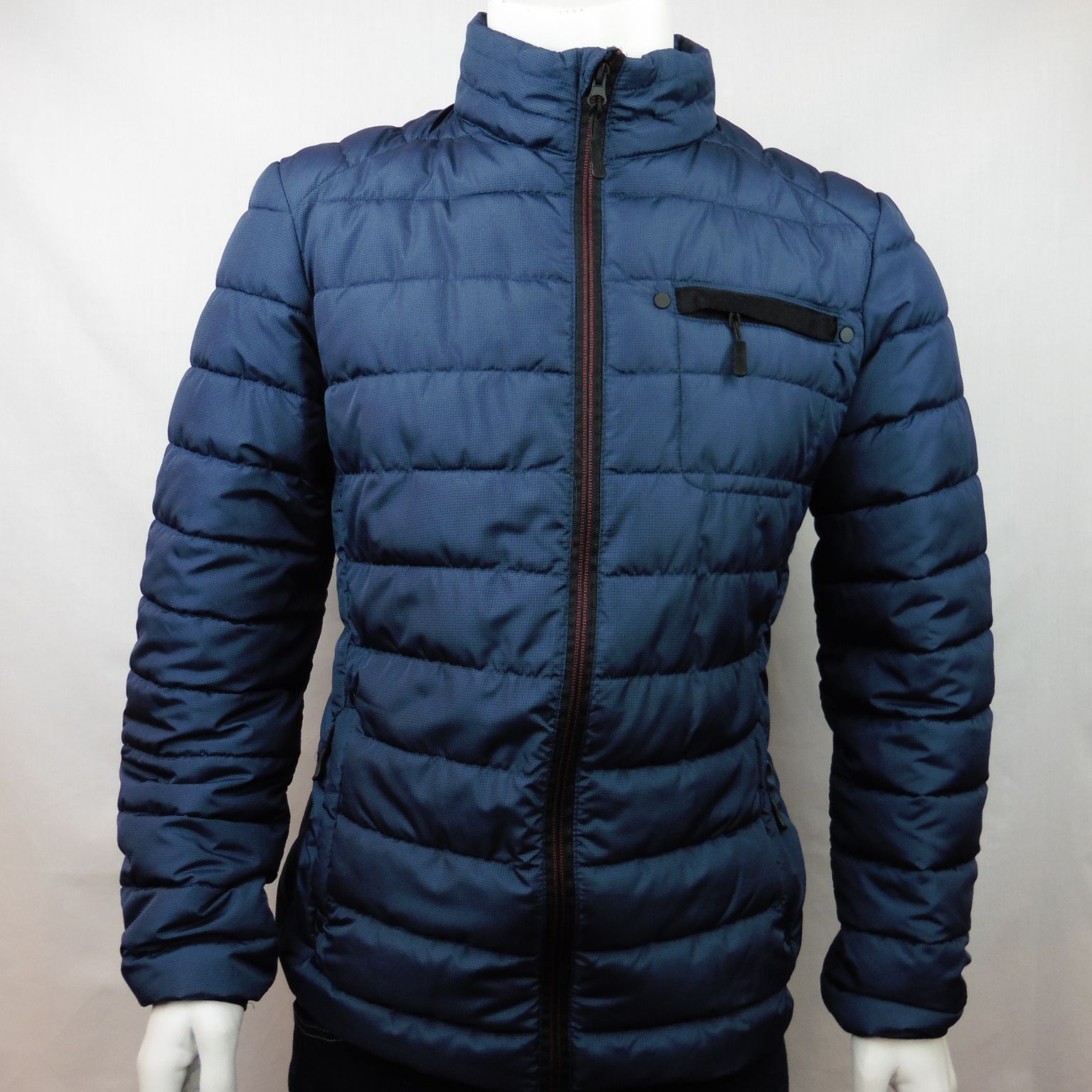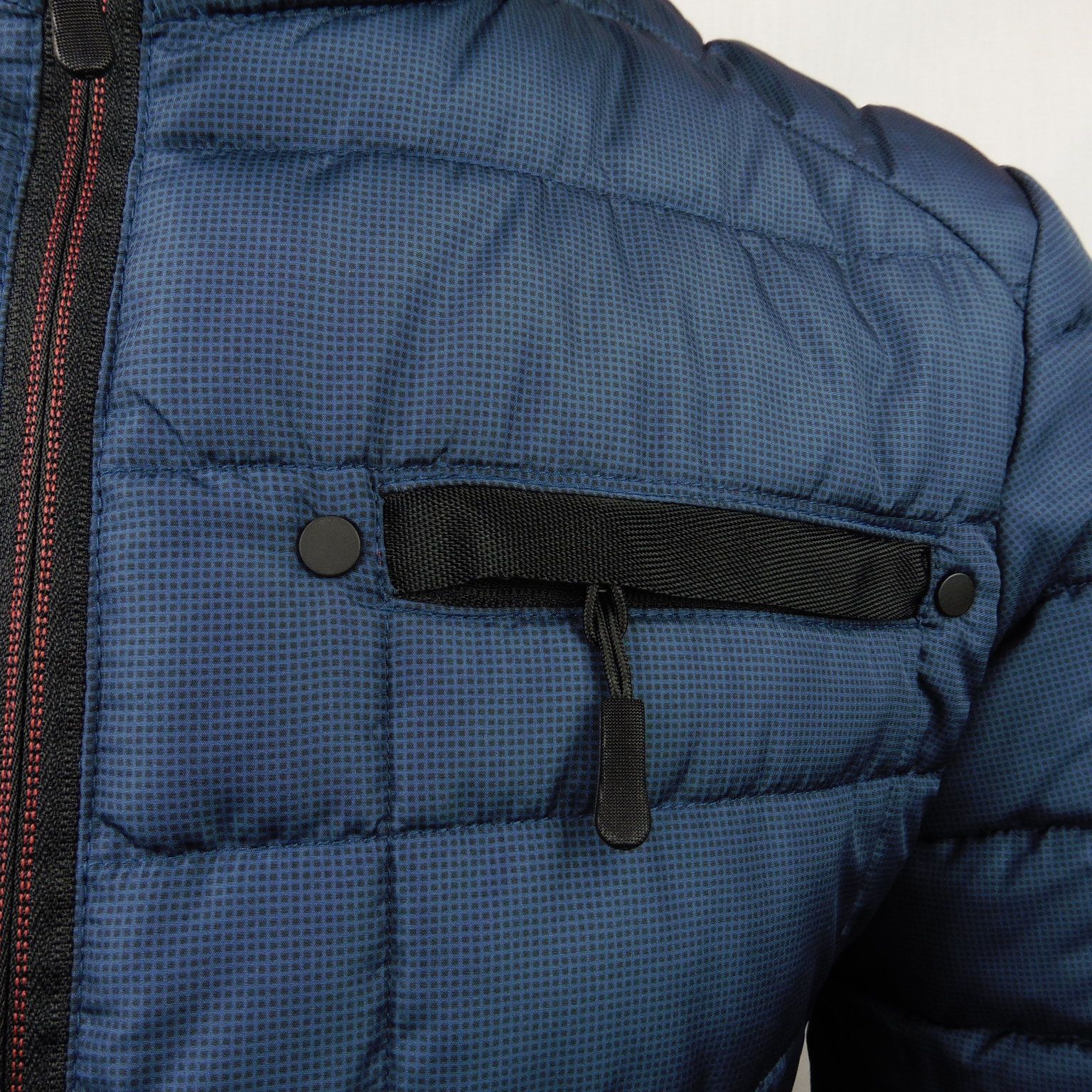 Cazadora de Alexander & Co., 100% poliéster, 3 bolsillos con cremallera delante y 2 interiores, vivo elástico en puños y bajo, en color azul marino con minicuadros negros