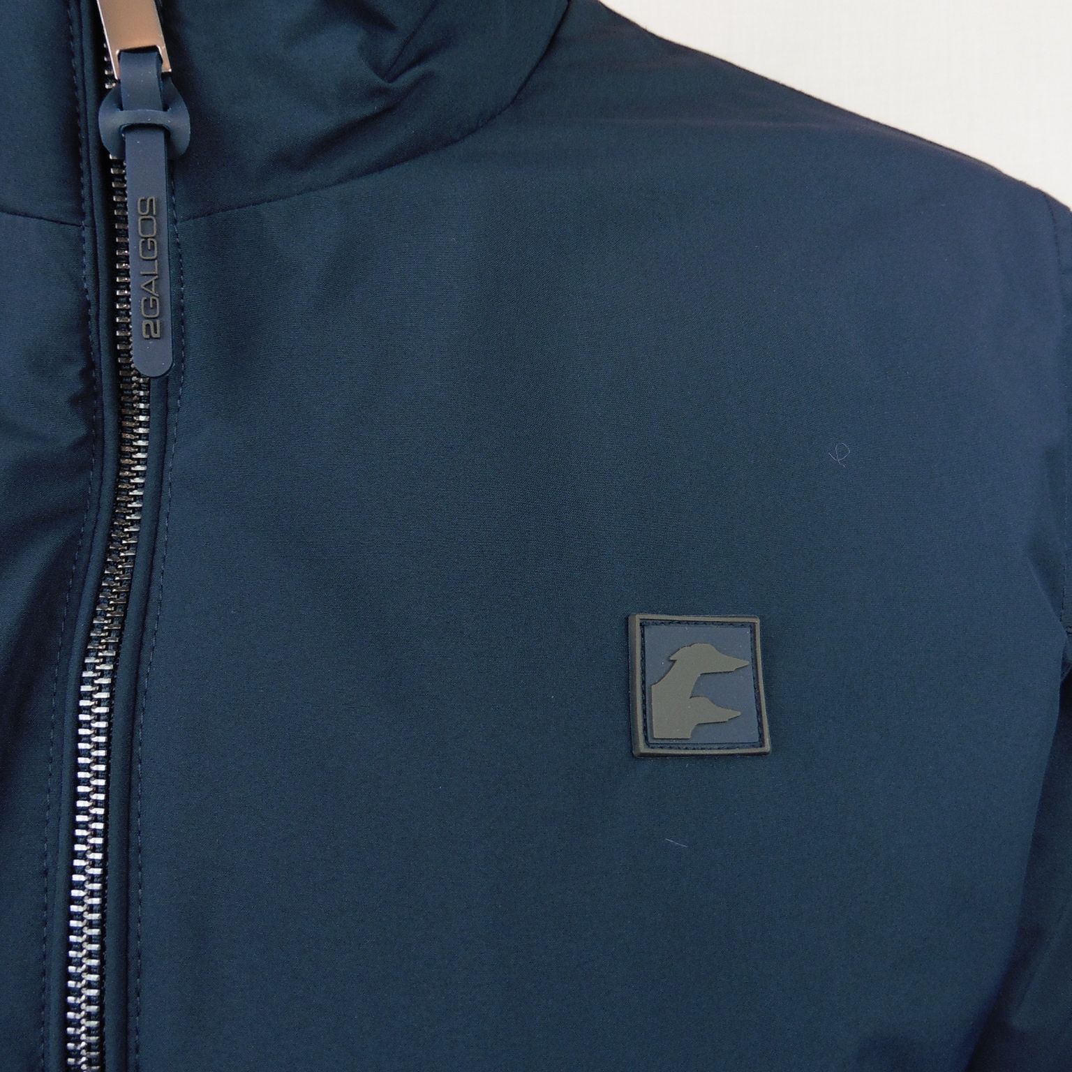Cazadora de Dos Galgos, 100% poliester, acolchada, dos bolsillos con cleck interno y 2 bolsillos interiores con cremallera, en color azul marino con vivo verde en puños y bajo