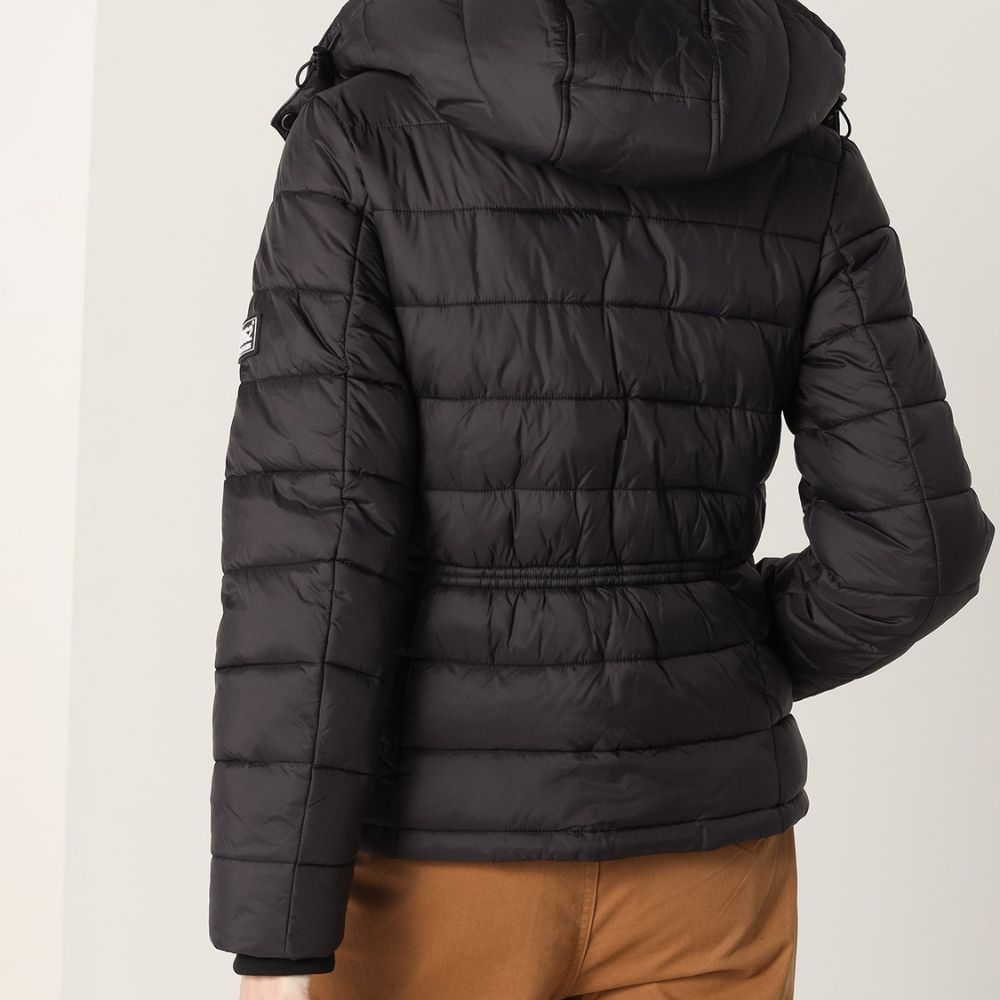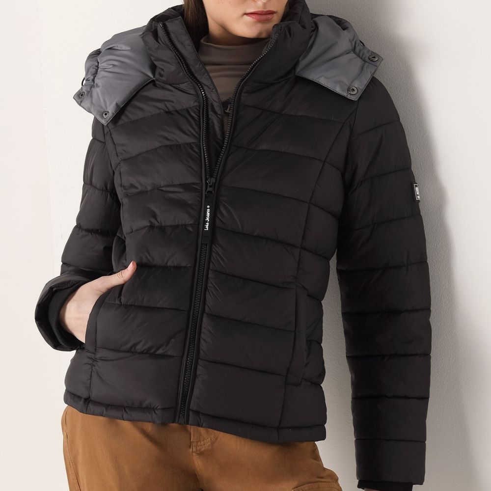 Cazadora acolchada de Lois, 100% poliamida, con capucha fija, en color negro, 2 bolsillos, goma en interior de puños