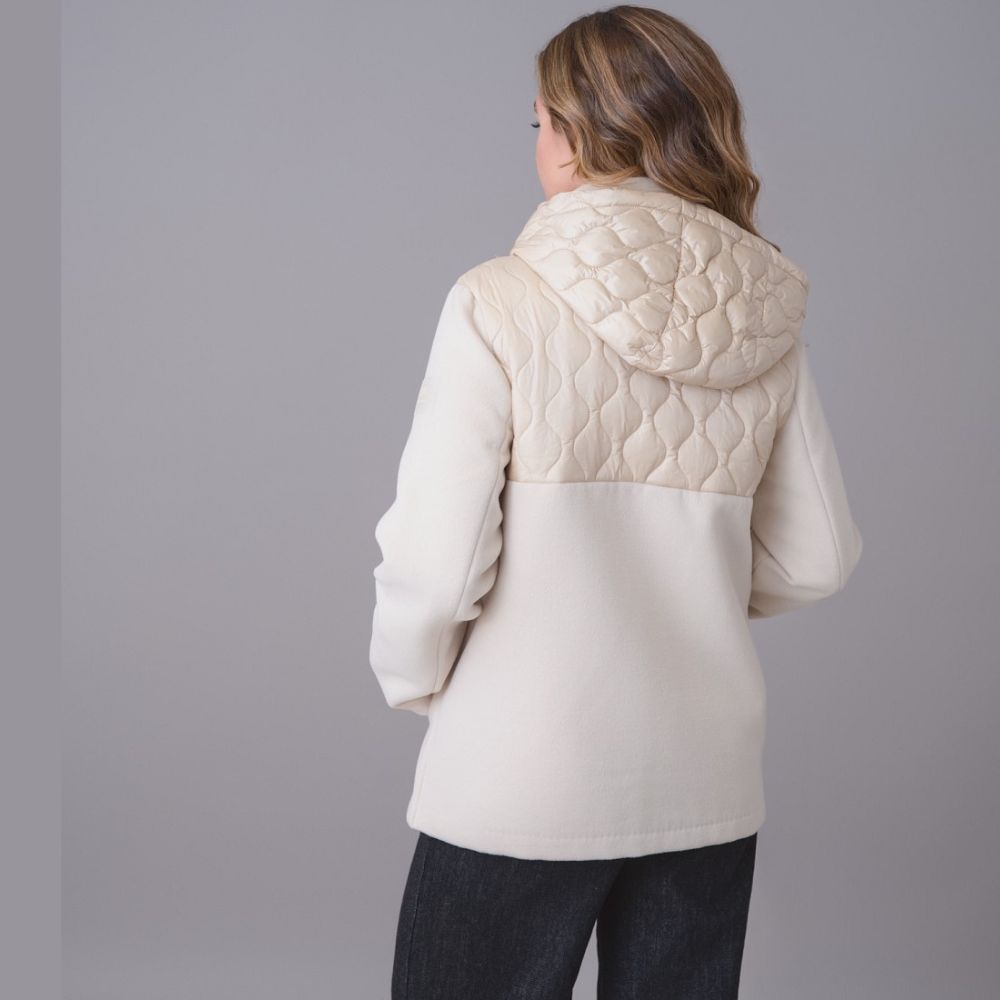 Chaleco de WNT Collection, tejido liso 90% poliéster 10% rayon, tejido con dibujo 100% nylon, forro y acolchado 100% poliéster, 2 bolsillos, semi forrada, cremallera con tapa y botones de trenka, capucha desmontable, en color crudo