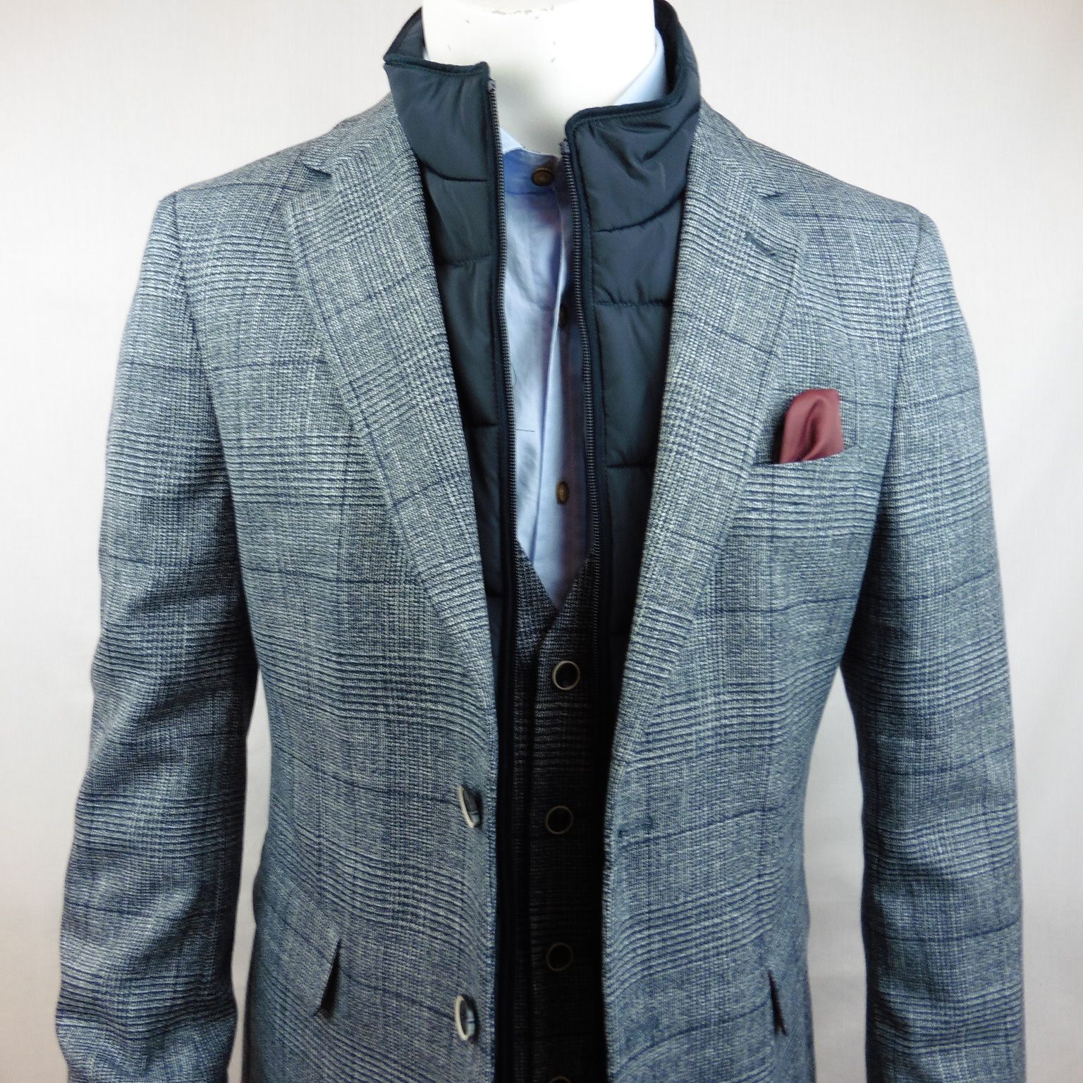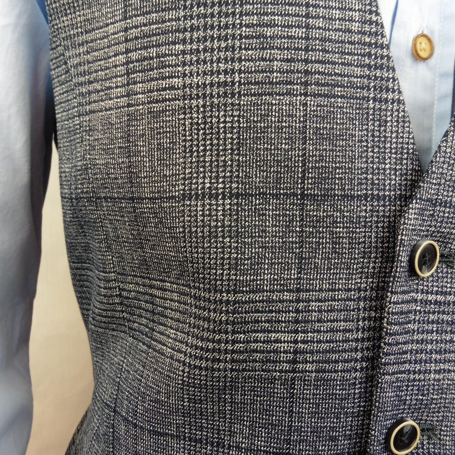 Chaleco de Alexander & Co., 89% poliéster 10% viscosa 1% elastano, de cuadros en tonos azul marino, con botones, 2 bolsillos de ojal, goma oculta en la espalda para entallar en cintura, forro 100% poliéster