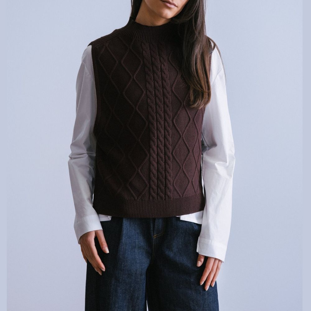 Chaleco de WNT Collection, 75% viscosa 25% poliamida, con semi cisne, en color marrón con ochos y rombos al tono, cortes laterales, parte trasera más larga