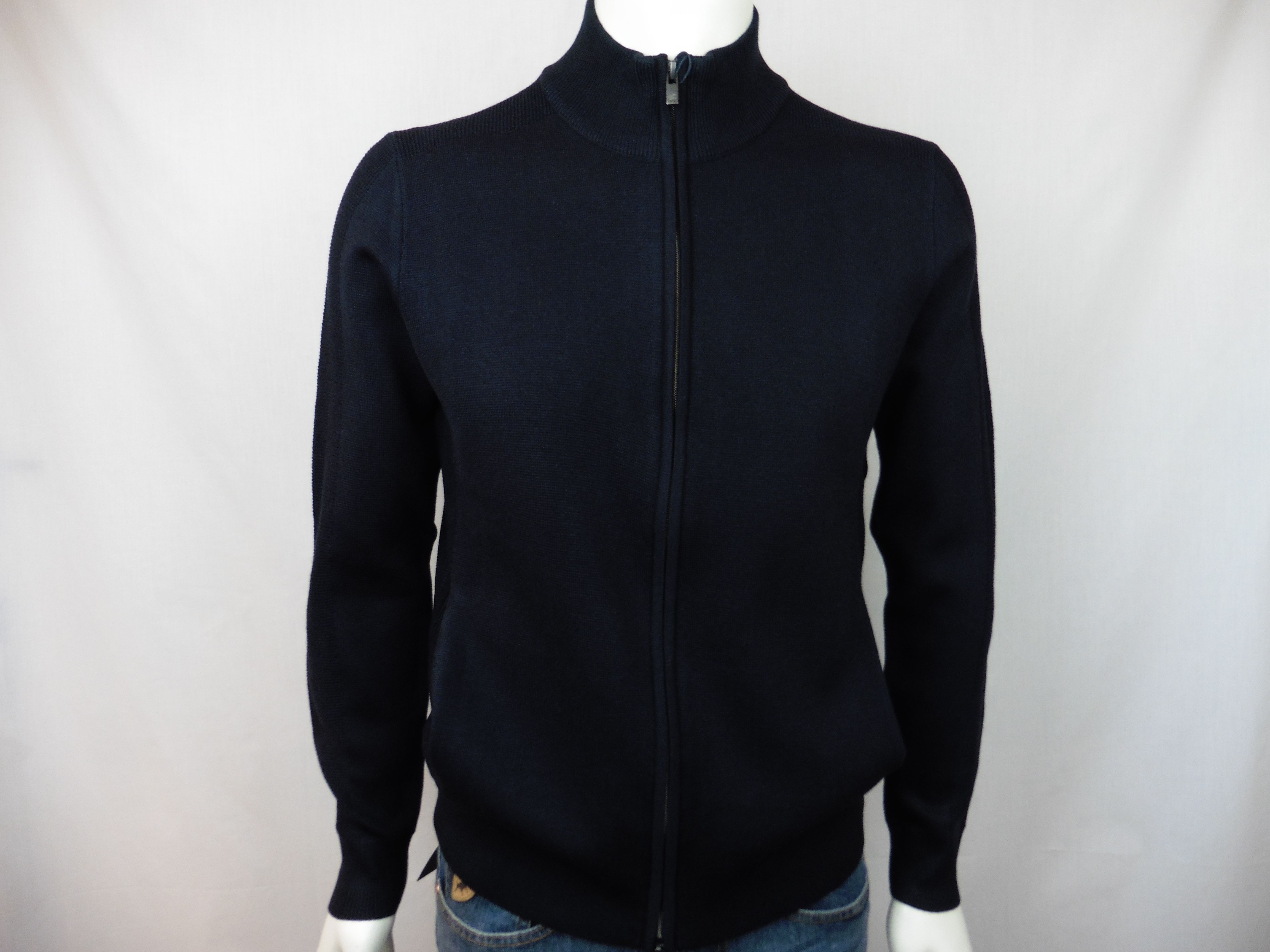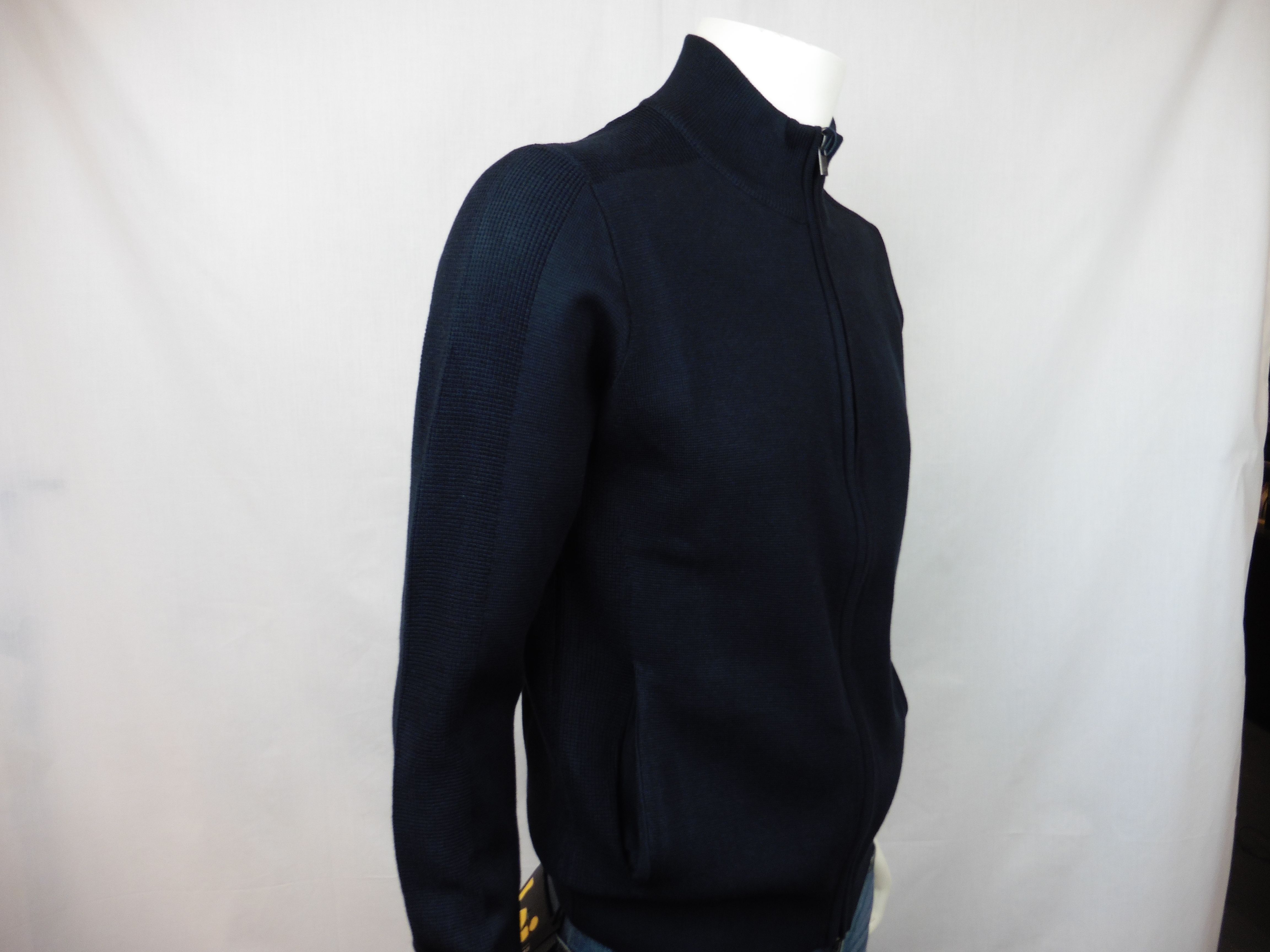 Chaqueta punto de Dos Galgos, 40% viscosa 40% acrílico 20% poliamida, cuello semi cisne con cremallera, 2 bolsillos, en color azul marino con franja al tono en laterales y mangas