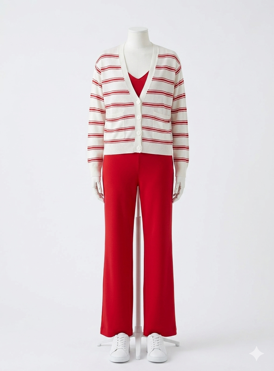 Chaqueta punto de Surkana, 100% viscosa, ecote pico con botones, en color blanco con rayas rojas, 2 bolsillos plastron