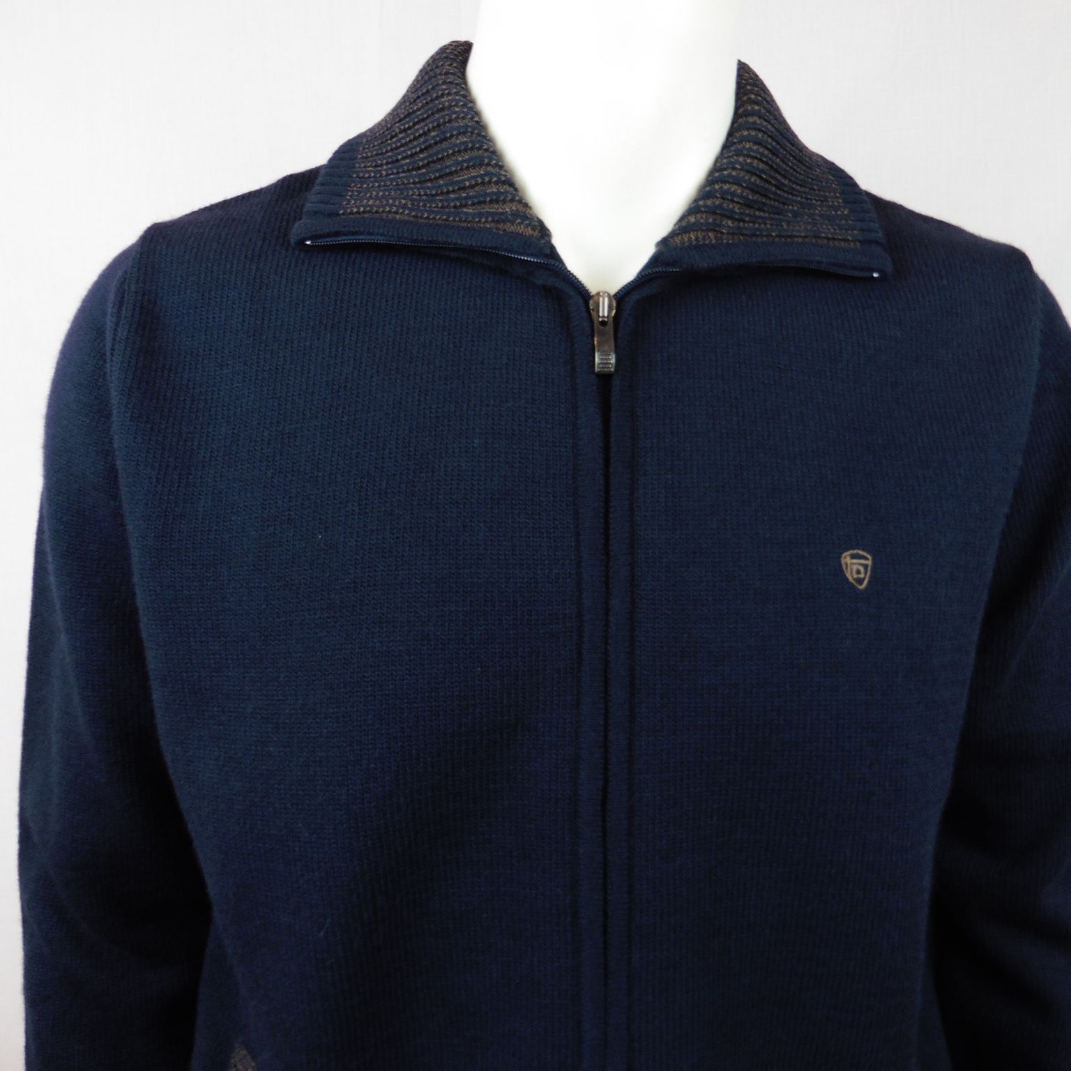 Chaqueta punto de Tomé, 70% acrílico 30% lana, en color azul marino con detalles ocre en cuello y bolsillos, dos bolsillos inclinados
