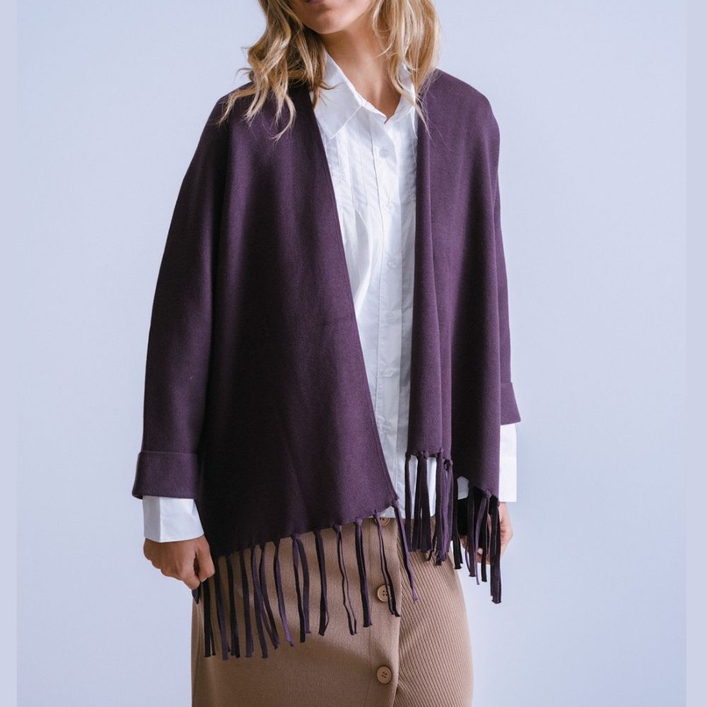 Chaqueta tipo poncho de WNT Collection, 75% viscosa 25% poliamida, manga ranglan con doble, flecos abajo, en color berenjena