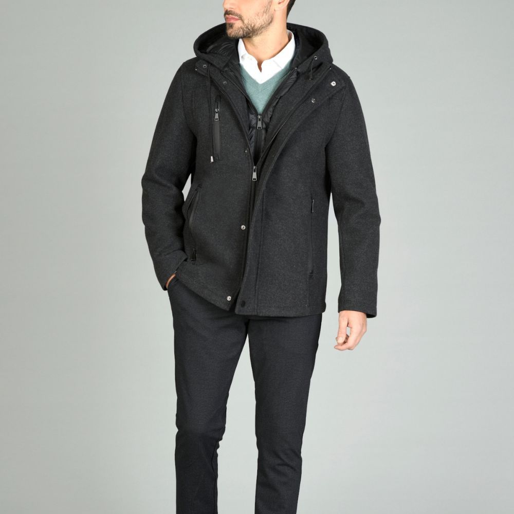Chaquetón de Alexander & Co., 100% poliéster, capucha con pechera desmontable, 3 bolsillos con cremallera delante y 2 interiores, con cierre de cremallera y tapa con clecks, en color gris oscuro