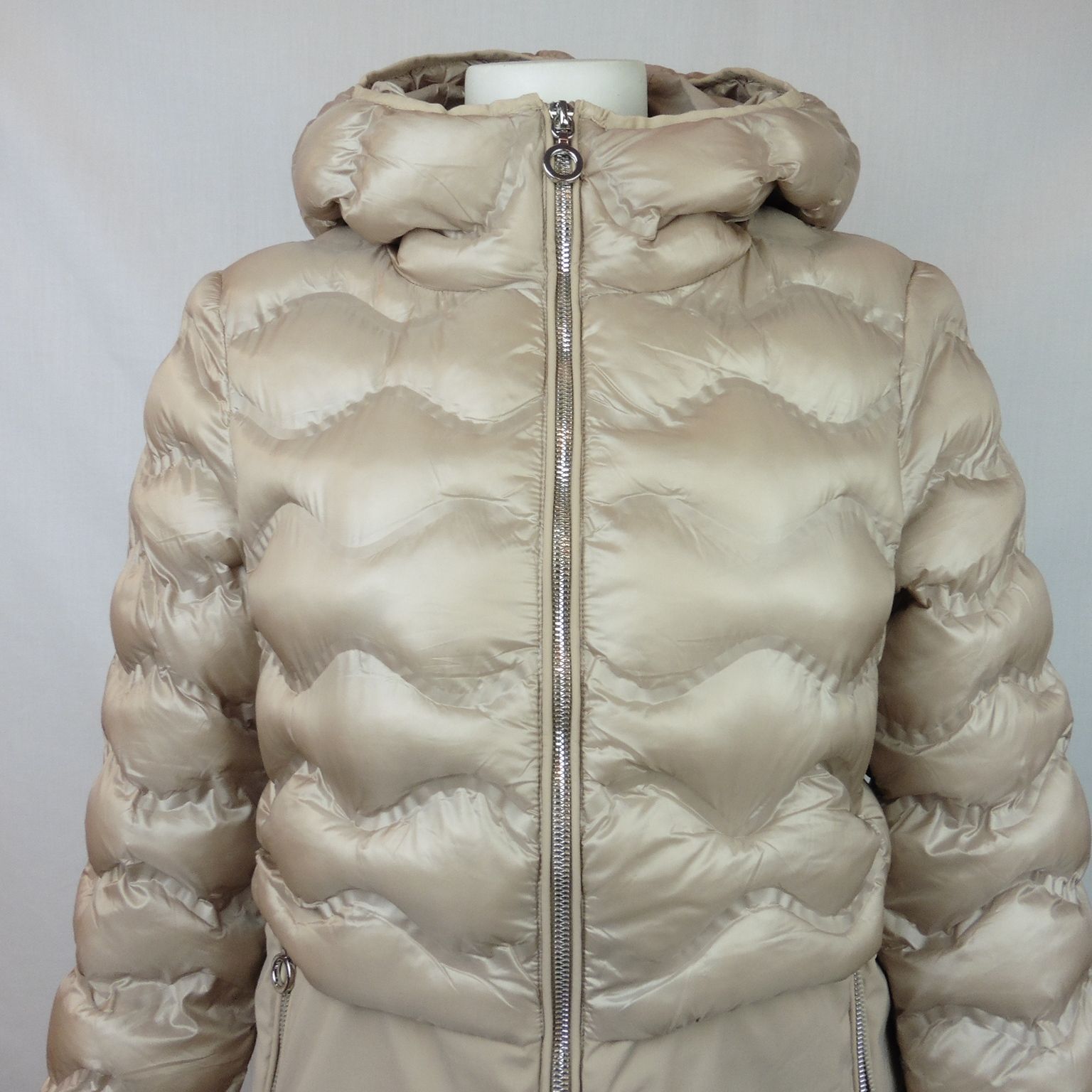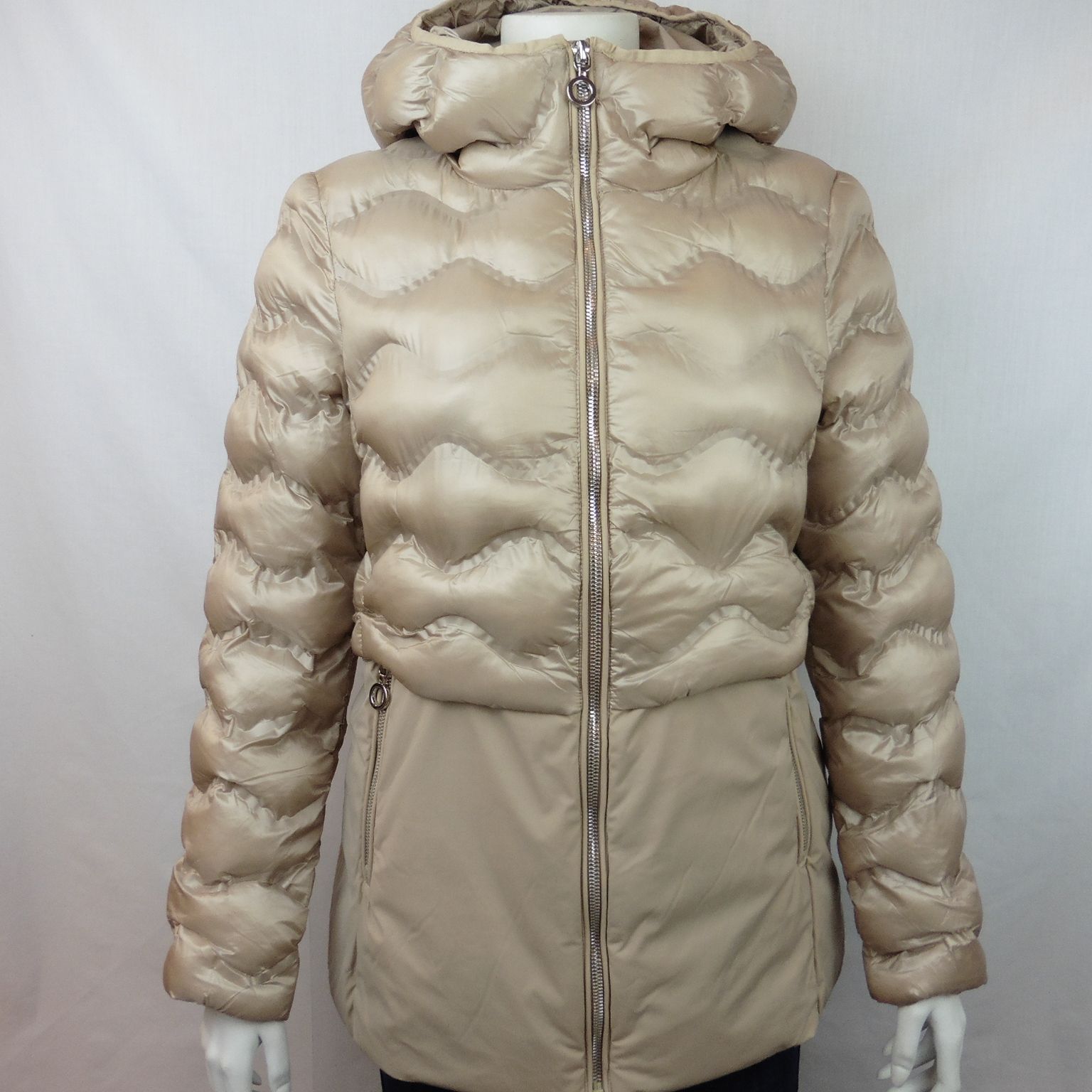 Chaquetón de WNT Collection, tejido externo liso 95% poliamaida 5% elastano, tejido externo brillo 100% nylon, relleno 100% políester, parte de arriba con brillo y capucha fija, parte de abajo lisa con dos bolsiilos de cremallera, en color beige