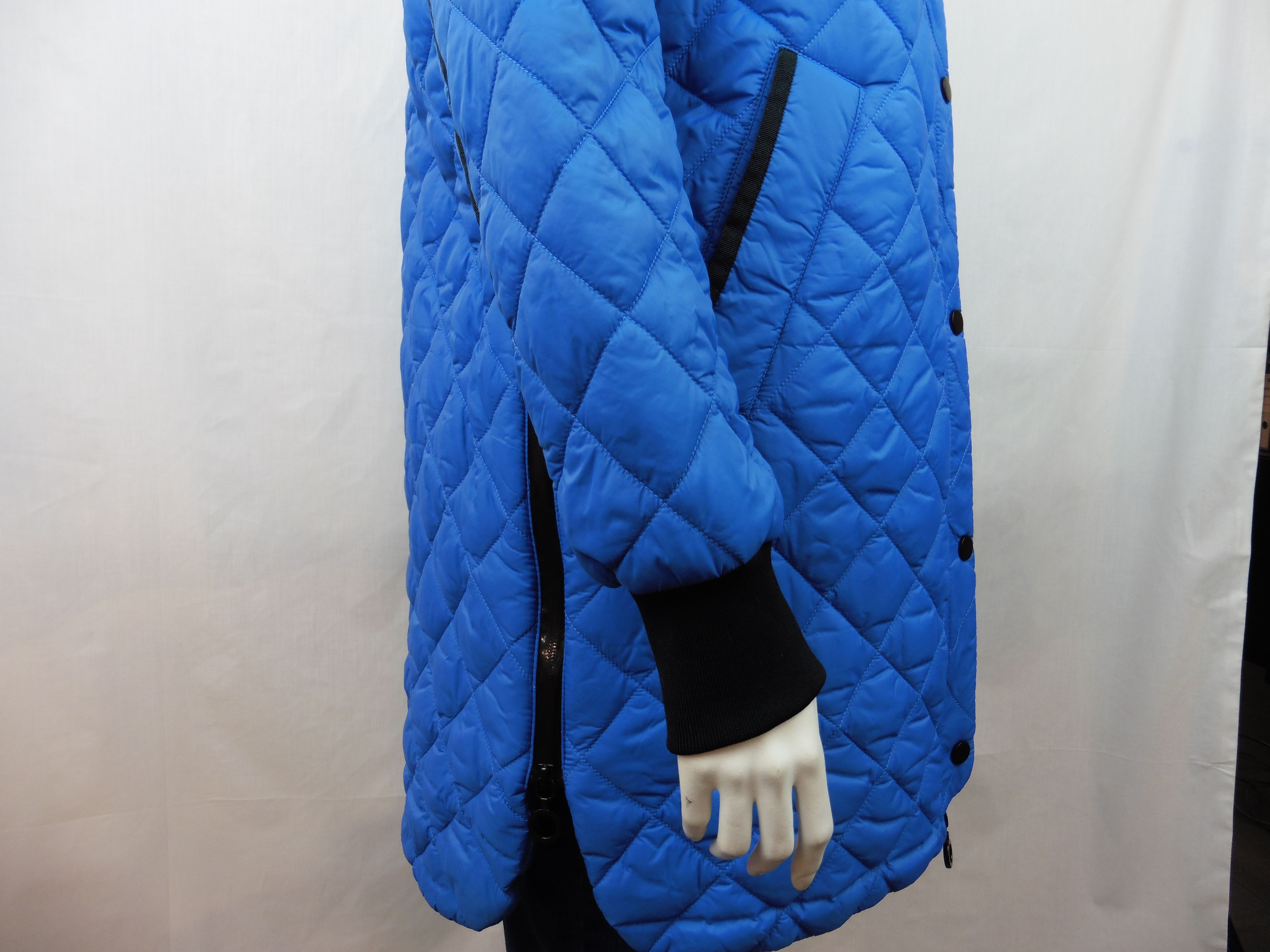 Chaquetón midi de WNT Collection, tejido exterior 100% nylon, forro y relleno 100% poliéster, cuello y puños de punto en color negro, dos bolsillos, cremalleras en los laterales en color negro, en color azulon con vivo negro en hombros y bolsillos