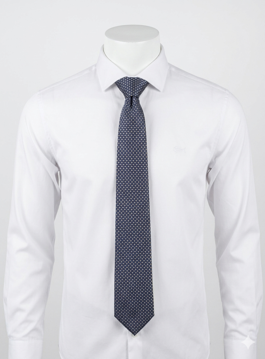 Corbata de Cencibel, 100% poliéster, pala de 7 centímetros, en color azul marino con mini dibujo beige y azul