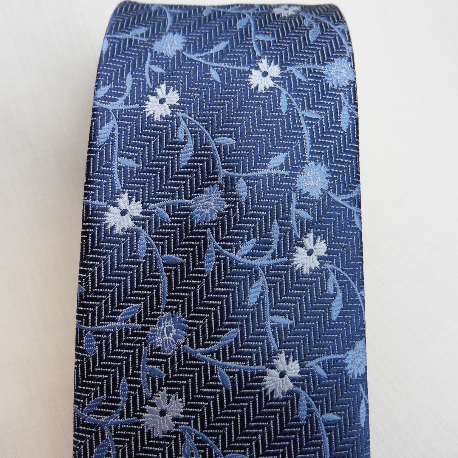 Corbata de Cencibel, 100% poliéster, pala de 7 centímetros, en color azul marino con flores y guiones en tonos azules