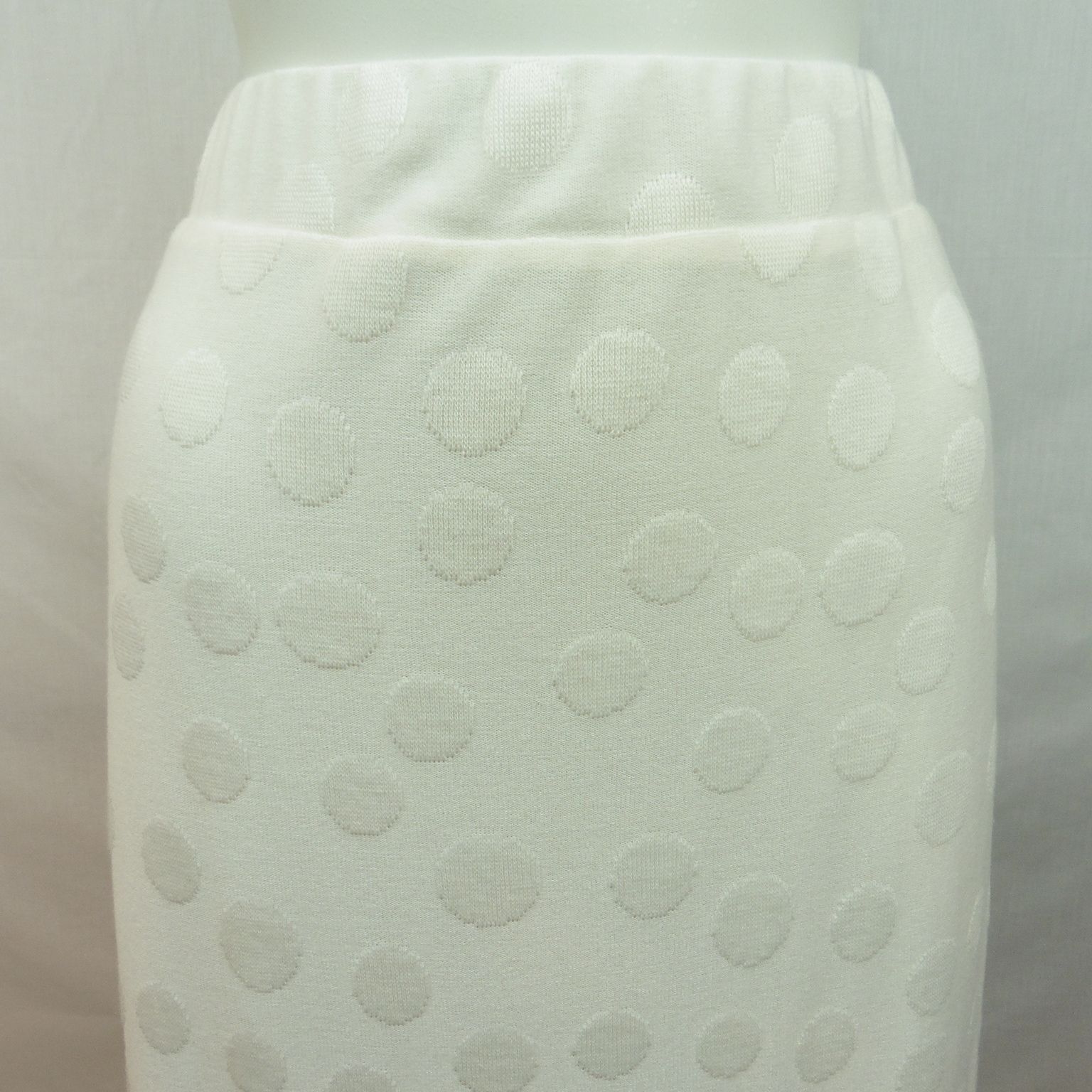 Falda de Lourdes Castillo, 65% poliéster 28% rayon 7% spandex, goma en la cintura, forrada, cortes laterales, en color crudo con lunares en relieve al tono