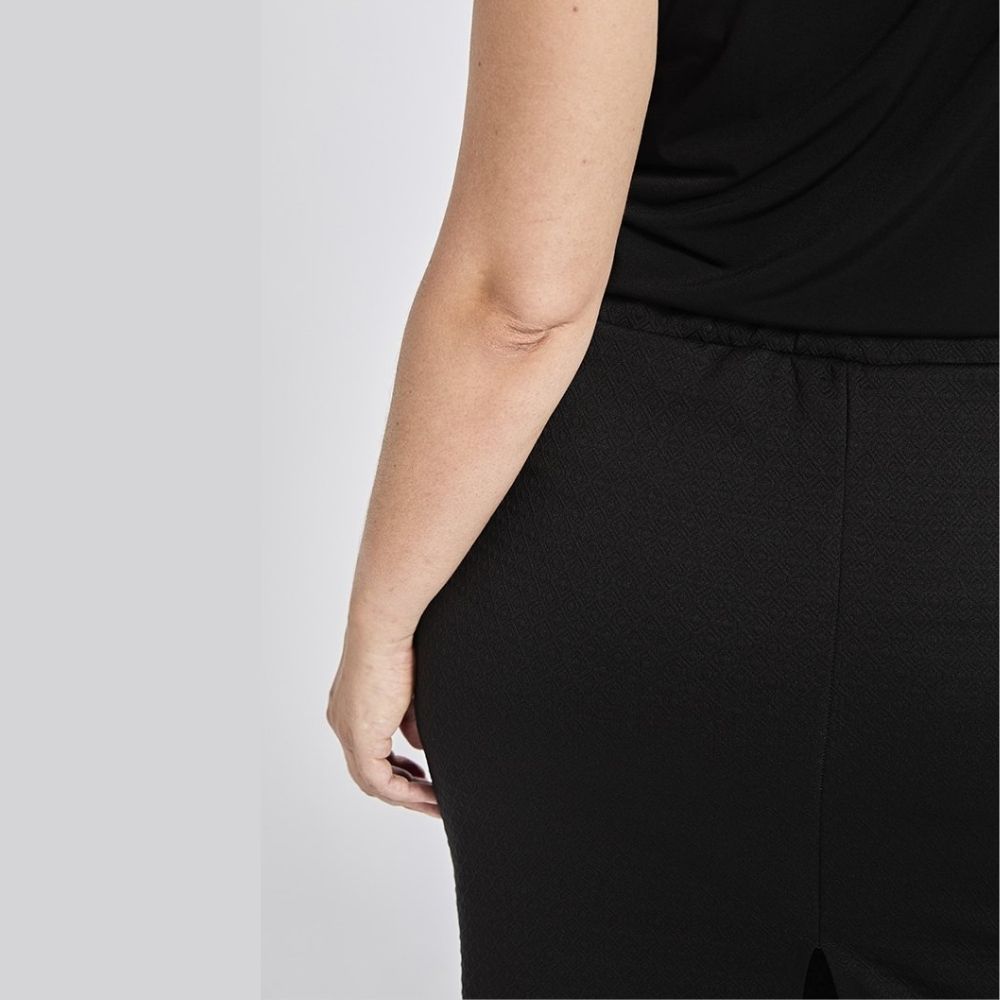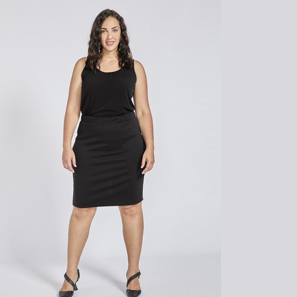 Falda de SPG Woman, 95% poliéster 5 elastan, de punto entubada, con dibujo en relieve al tono, en color negro, con goma en la cintura