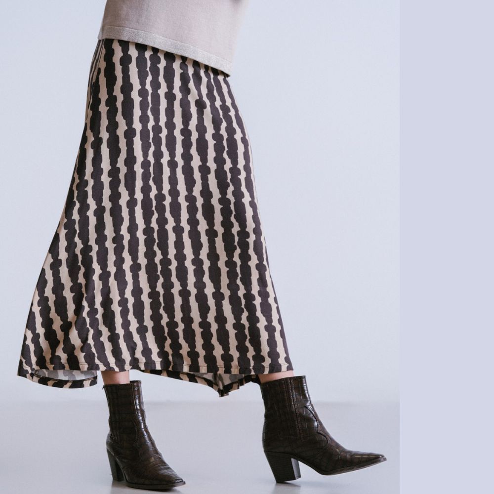 Falda de WNT Collection, 97% viscosa 3% elastano, larga con vuelo, goma en la cintura, en color beige con dibujo vertical grande en color marrón