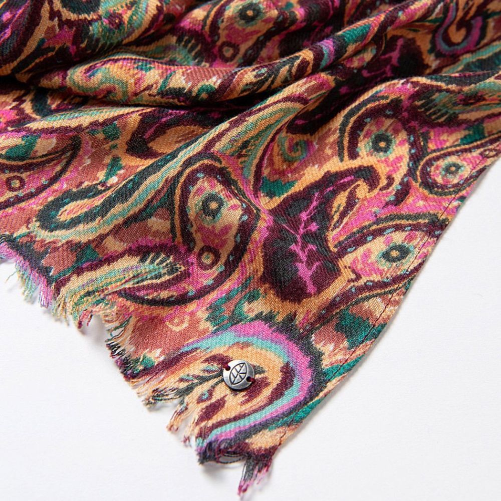 Foulard de Surkana, 65% viscosa 35% lana, estampado de cachemir en tonos berenjena, rosa, verde y ocre