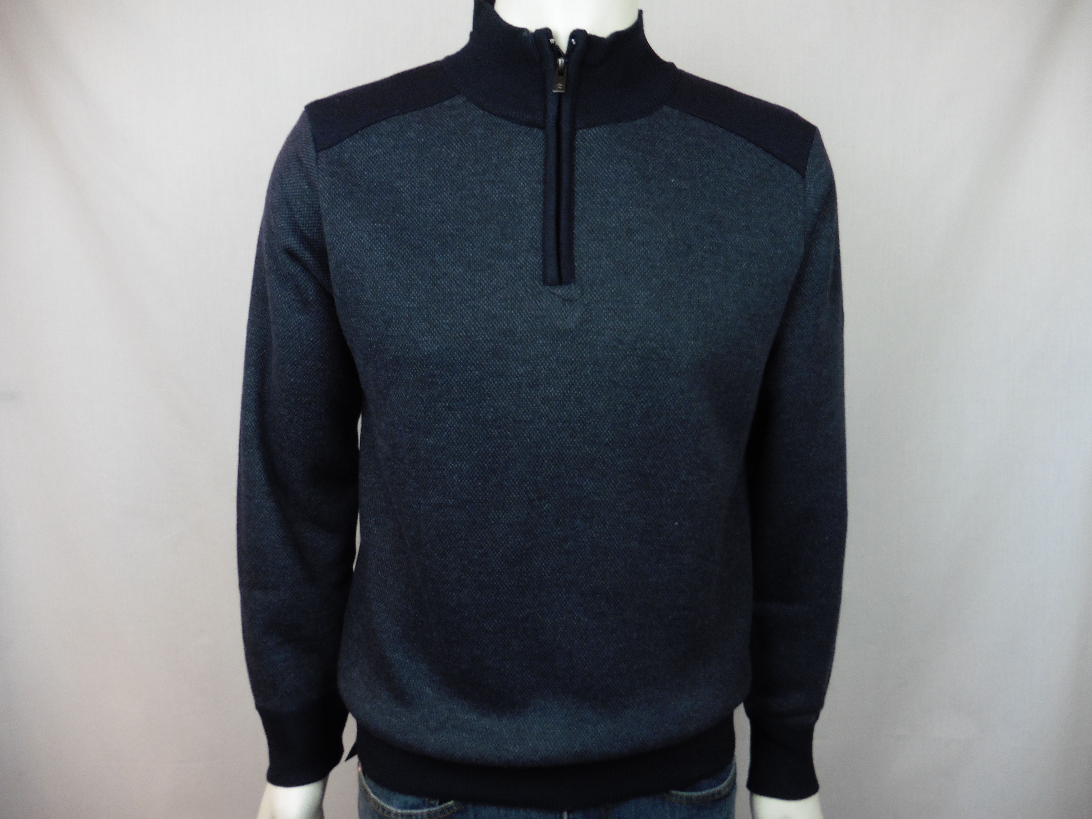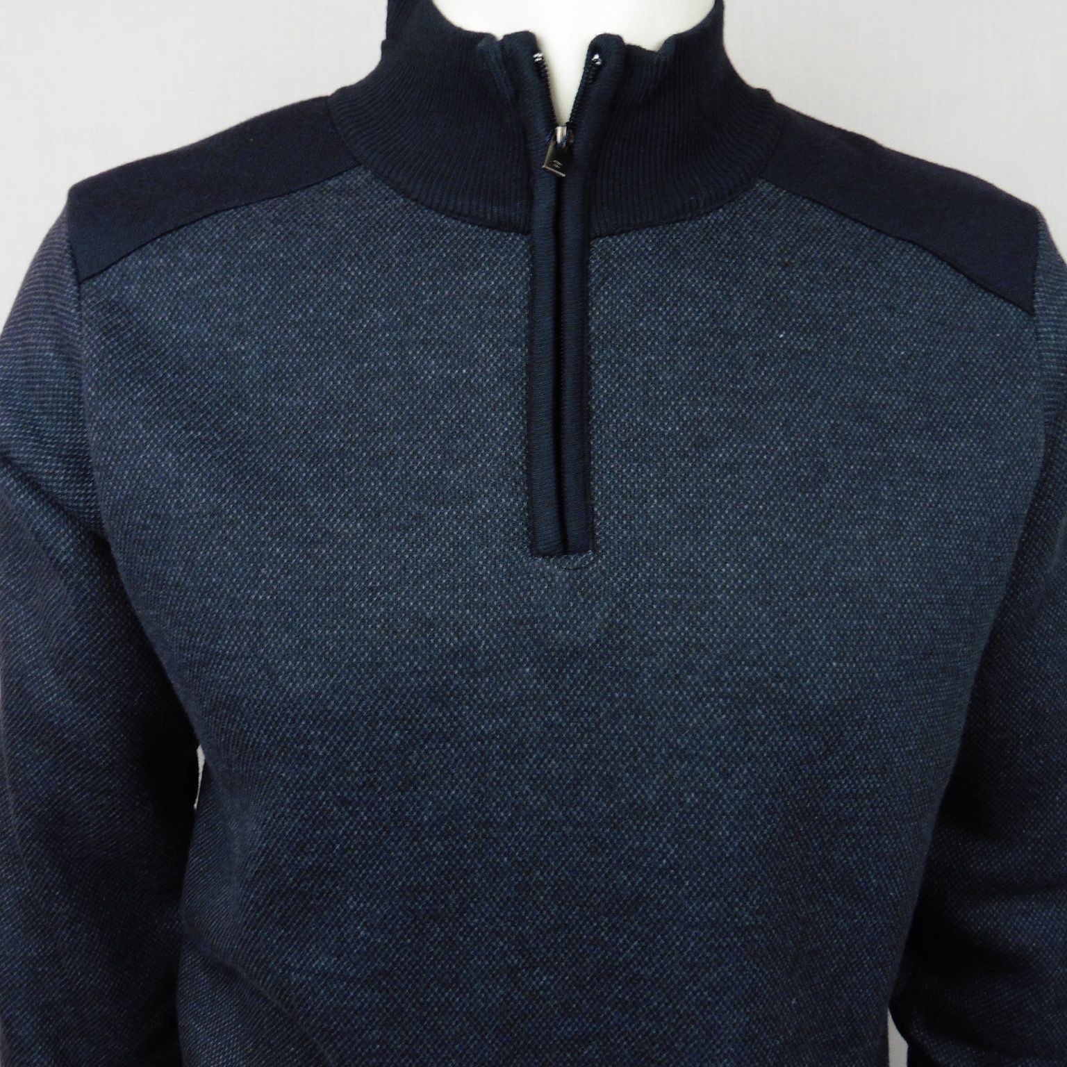 Jersey de Dos Galgos, 100% poliéster, cuello sem cisne con cremallera, forro cálido, en color azul marino con mini dibujo gris, hombros azul marino