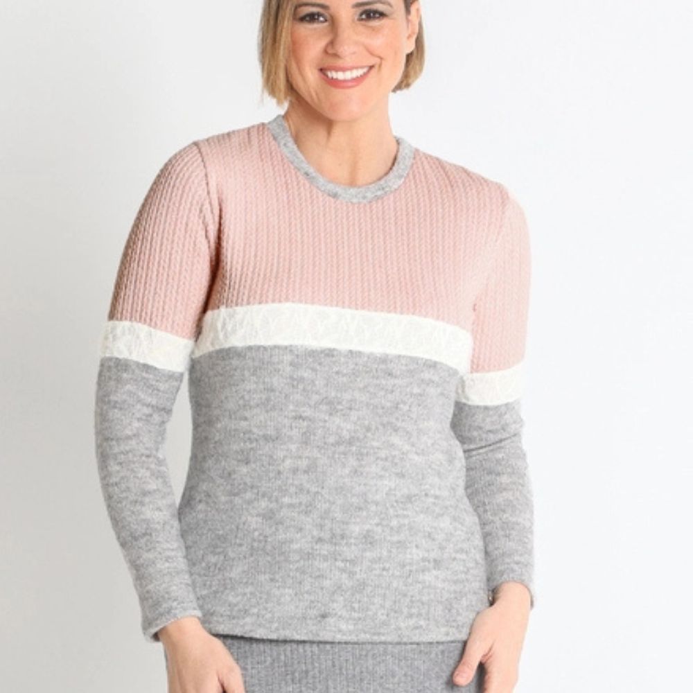 Jersey de Lourdes Castillo, 50% acrílico 25% poliéster 15% nylon 8% lana 2% elastano, cuello redondo, en color gris vigoré combinado con diferente punto arriba en color rosa y franja central en color crudo