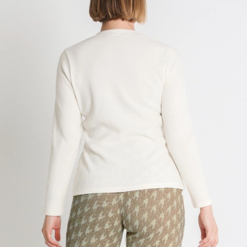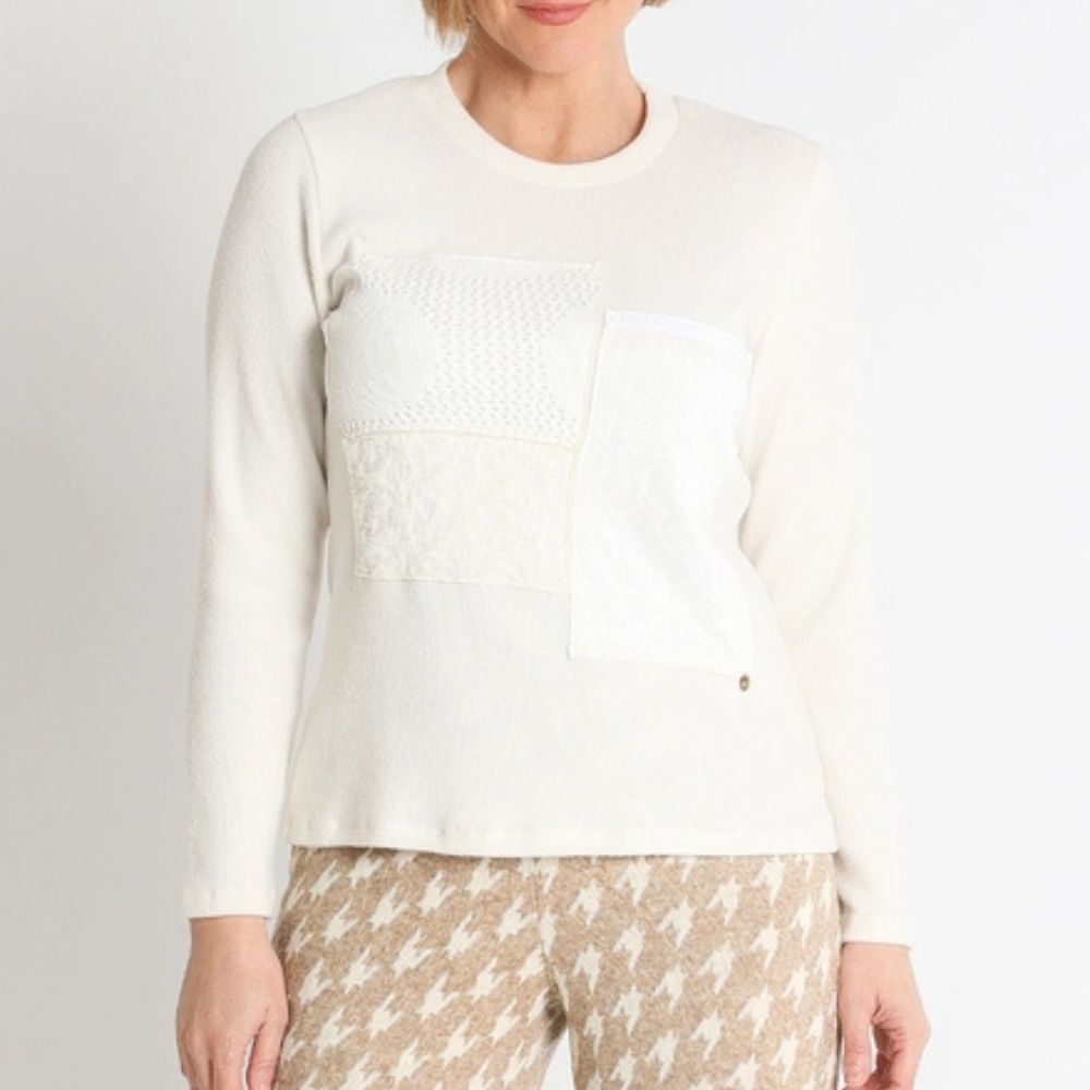 Jersey de Lourdes Castillo, 82% poliéster 13% rayon 5% elastano, cuello redondo, en color crudo con adornos al tono de patchwork delante