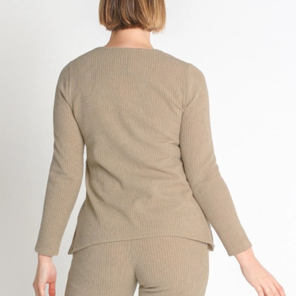 Jersey de Nayat, 90% poliéster 8% viscosa 2% elastano, cuello redondo, en color camel, punto simulando pana, adorno de antelina simulando bolsillo