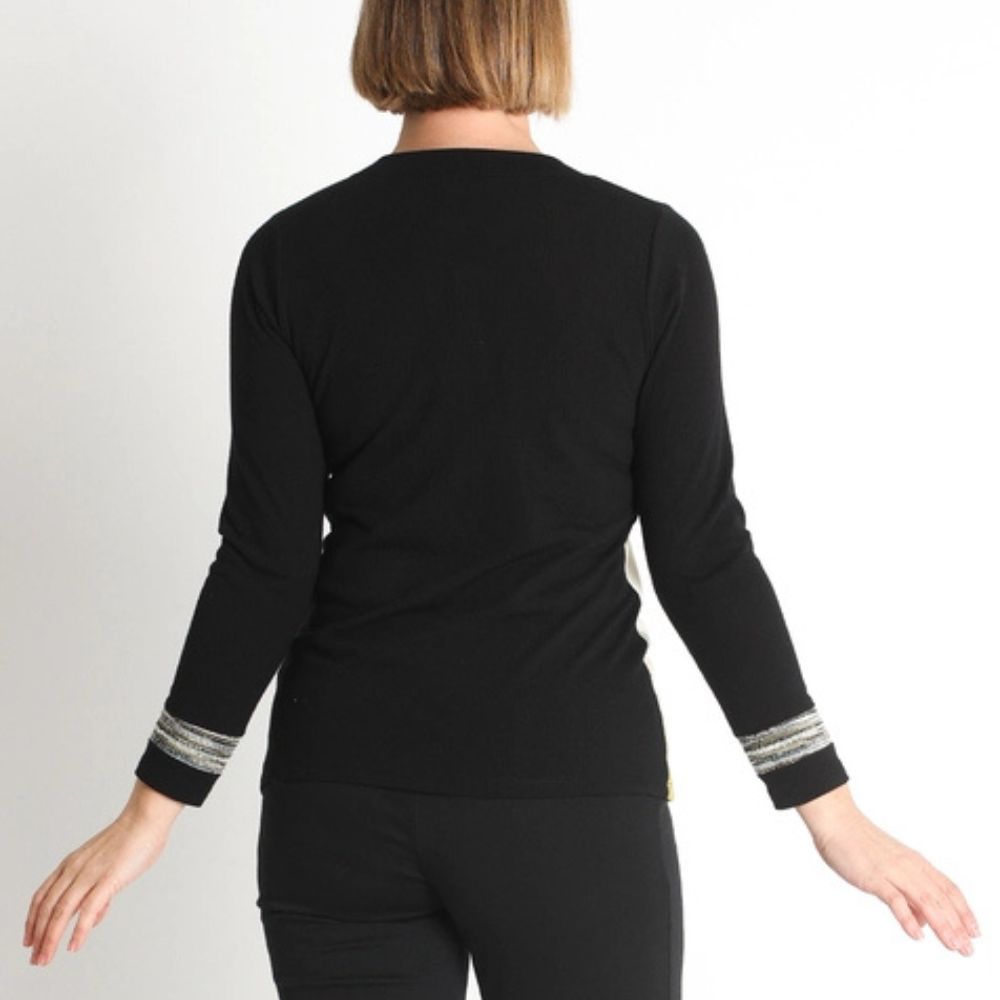 Jersey de Nayat, 75% poliester 10% rayon 4% lúrex 5% elastano, escote pico asimétrico, en color negro con estampado delante en tonos crudo y verde