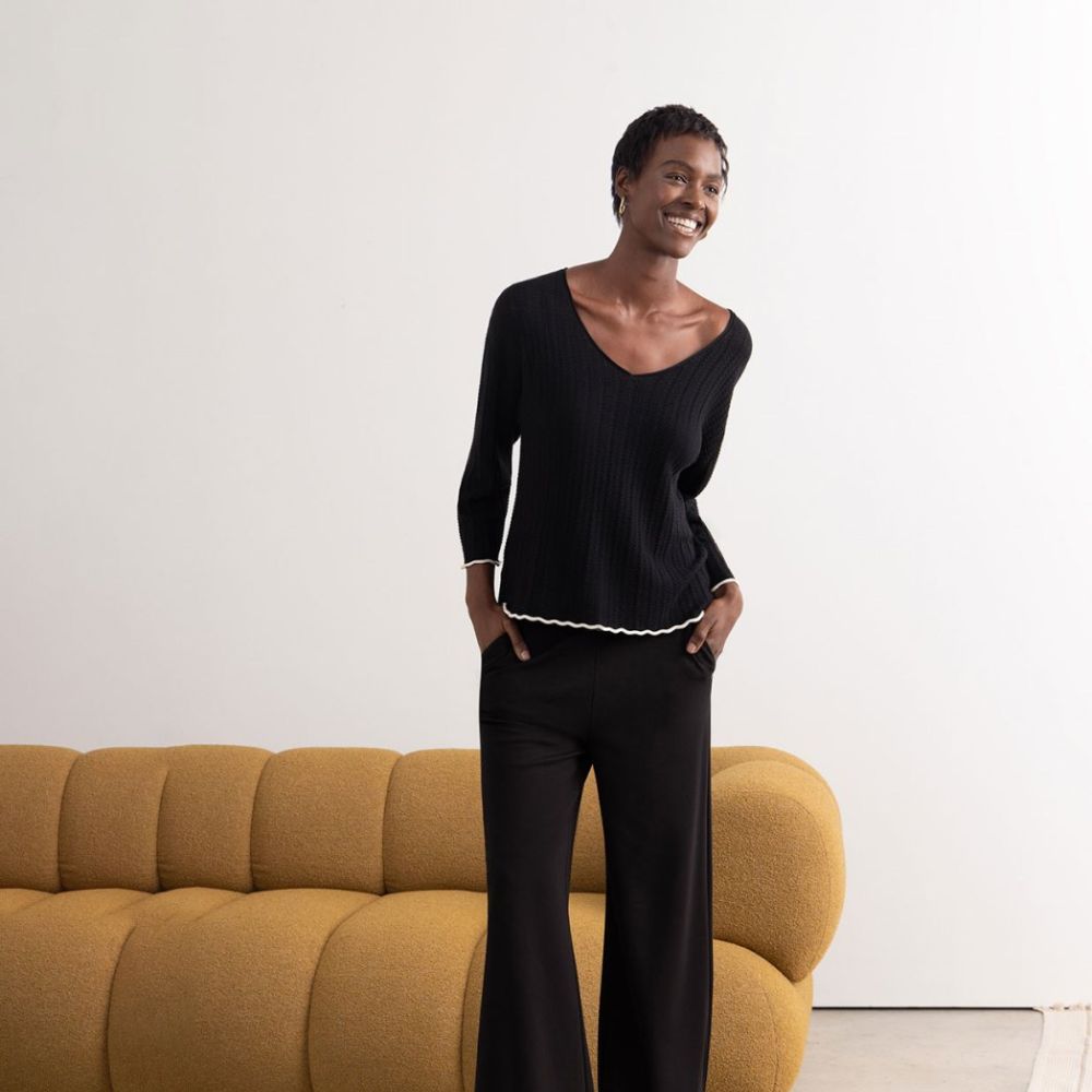 Jersey de Surkana, 80% viscosa de bambú 20% elastano, cuello pico rulado, manga ancha debajo del codo, punto calado y dibujo al tono, en color negro con borde beige en puños y bajo
