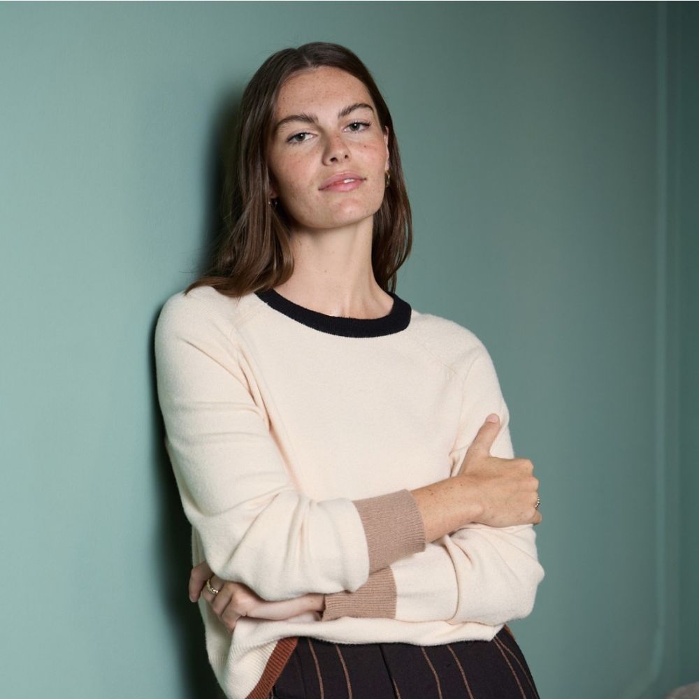 Jersey de Surkana, 50% viscosa 28% poliéster 22% poliamida, mangas ranglan, en color crudo, cuello negro, puños beige y bajo marrón