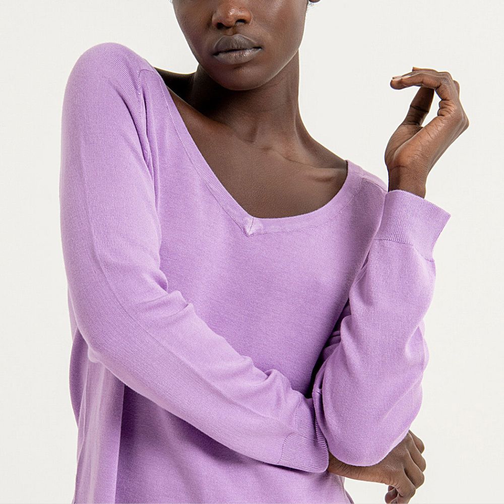 Jersey de Surkana, 80% viscosa bamboo 20% elastano, cuello pico, manga ranglan, en color lila
