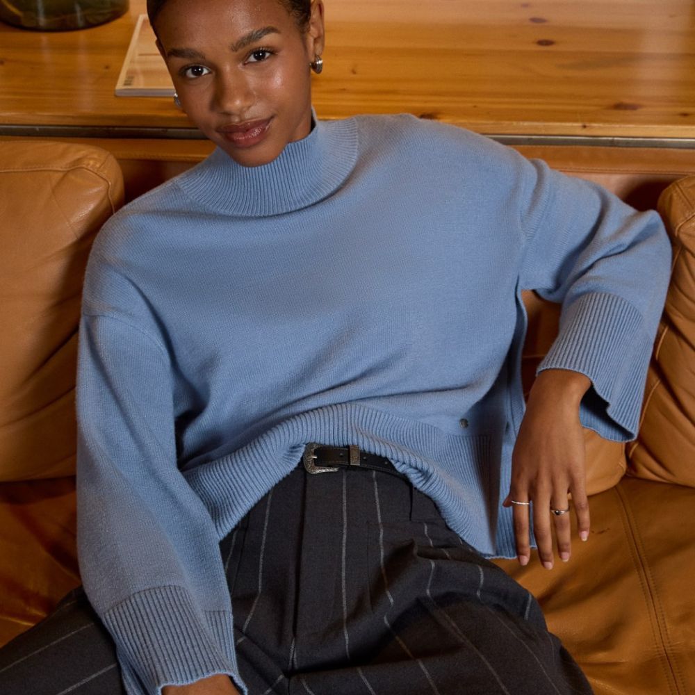 Jersey de Surkana, 50% viscosa 28% poliéster 22% nylon, over size, cuello semi cisne, cortes laterales, hombros caídos, mangas rectas y puños anchos, en color azul  medio