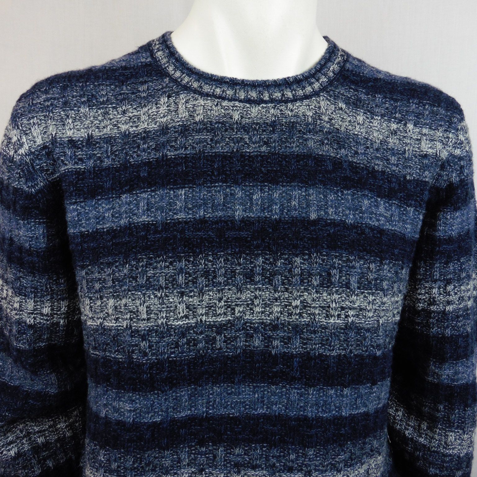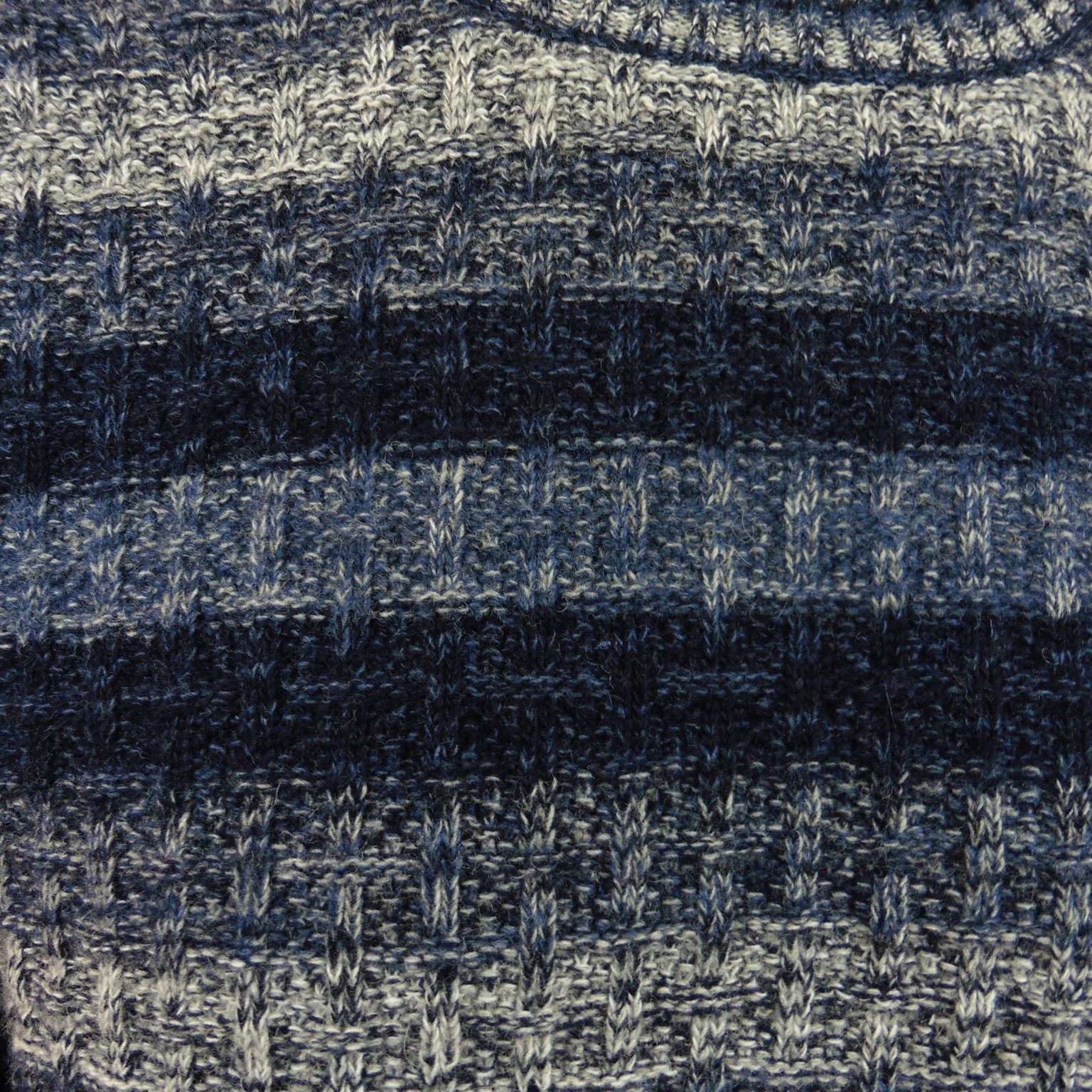 Jersey de Tomé, 25% poliamida 70% lana 5% otras fibras, cuello redondo con franjas en tonos azules vigoré