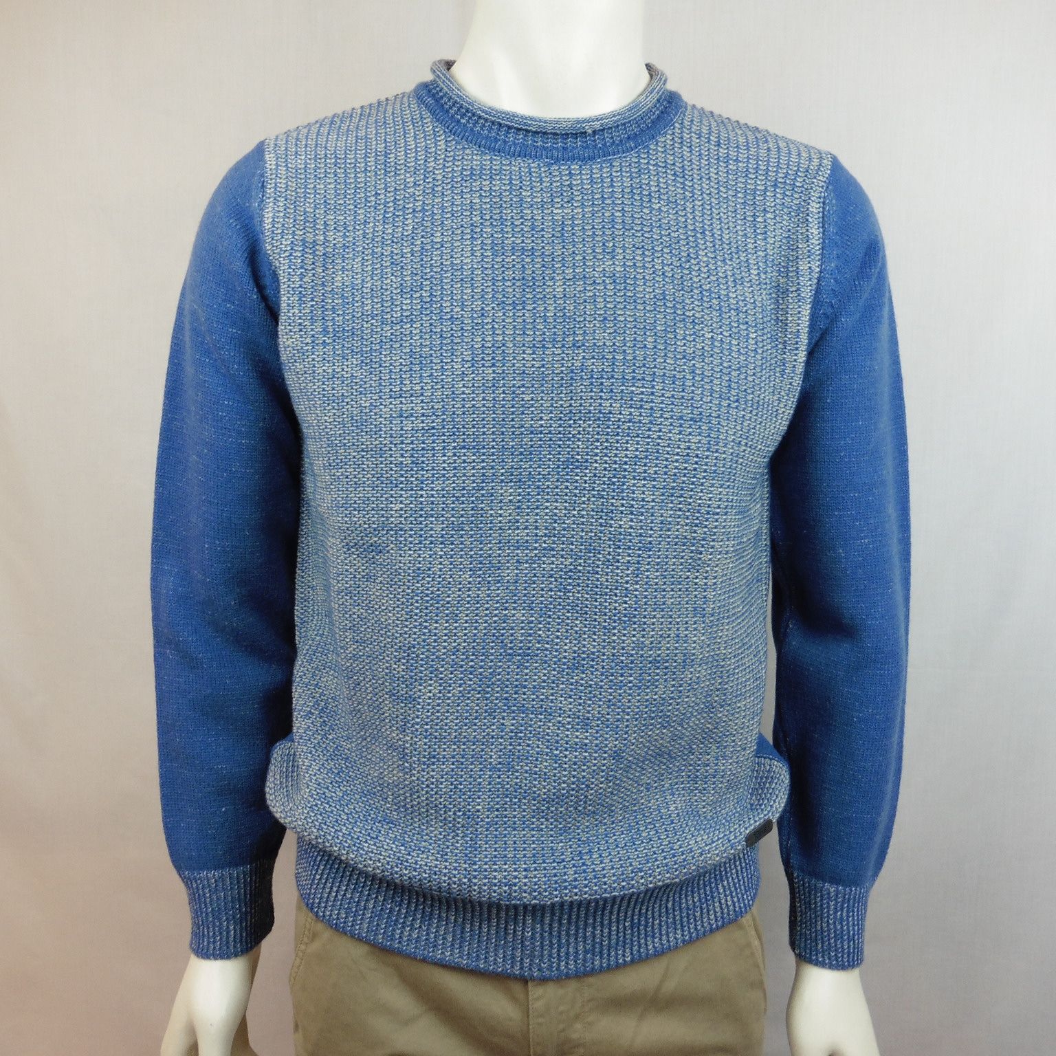 Jersey de Tomé, 70% acrílico 30% lana, cuello redondo en color azul tejano con trama crudo en la parte de delante