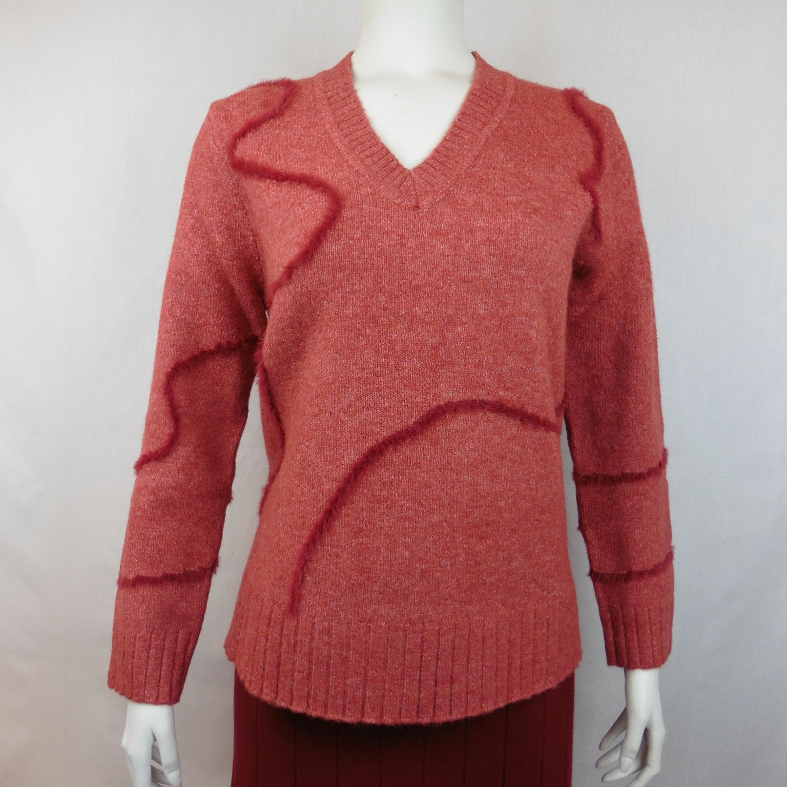 Jersey de WNT Collection, 40% acrílico 30% poliamida 27% nailon 3% spandex, de cuello pico, en color geranio vigoré con adorno de pelo haciendo ondas en color geranio