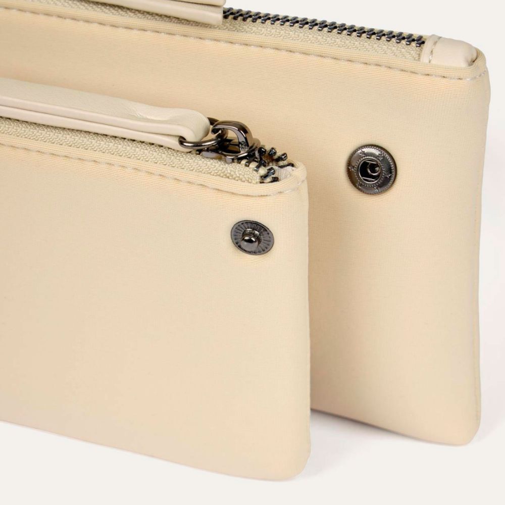Monedero de Surkana , 90% poliéster 10% poliuretano, dos bolsillos con cremallera separables, 3 bolsillos tarjeteros en el interior del grande, en color crudo
