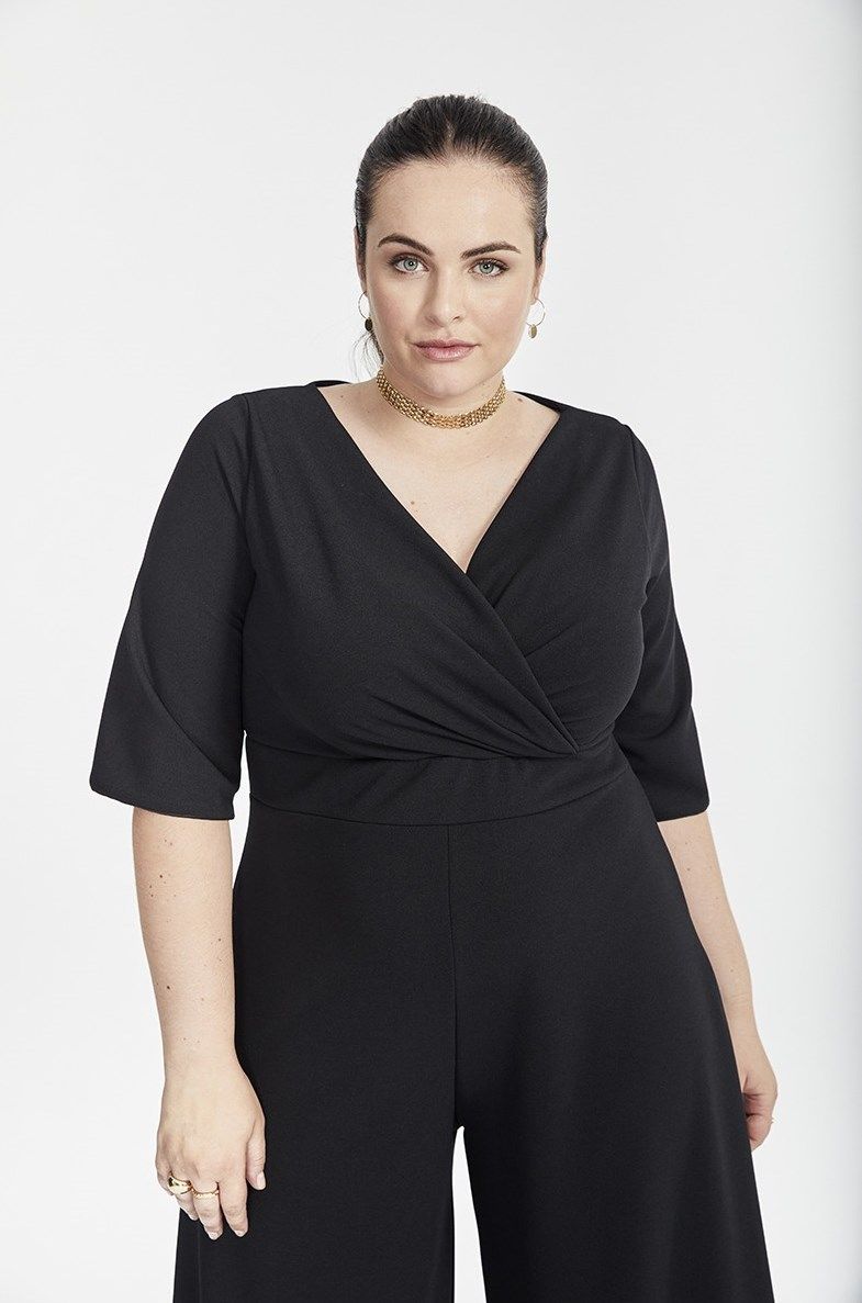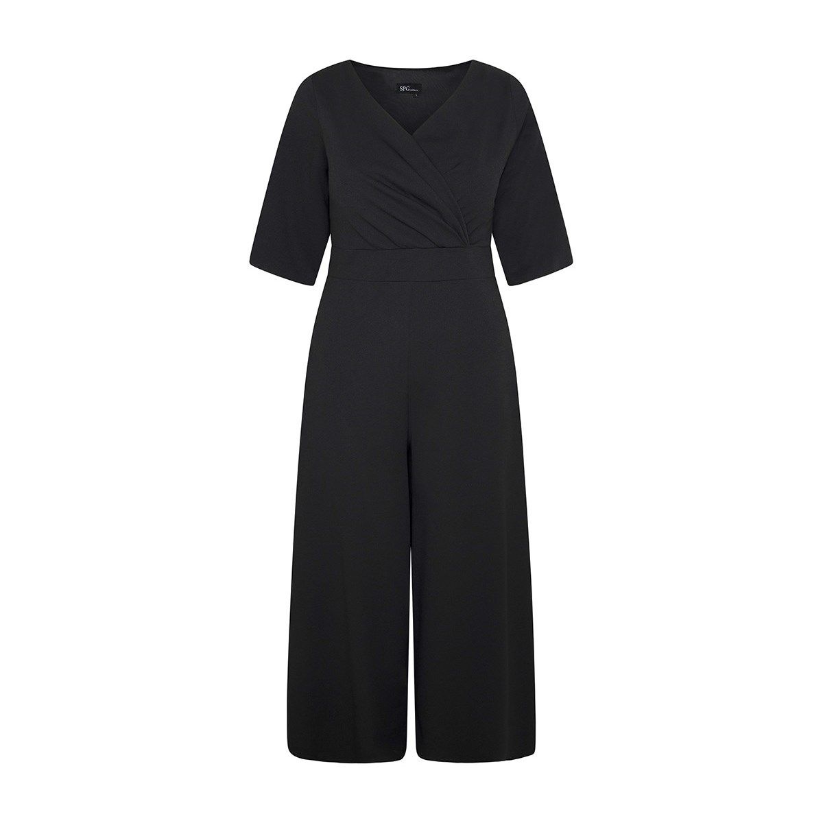 Mono de SPG Woman, 95% poiéster 5% elastan, manga al codo, escote cruzado, corte alto de cintura, camal ancho corto, en color negro