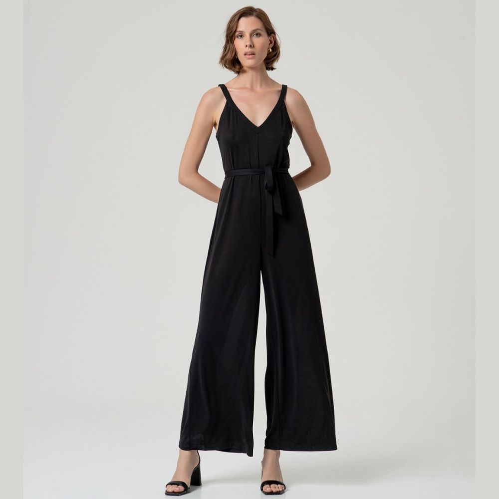 Mono de Surkana, 70% modal 30% poliéster, de punto, escotes pico, camal ancho, tirantes, con cinturón al tono, en color negro