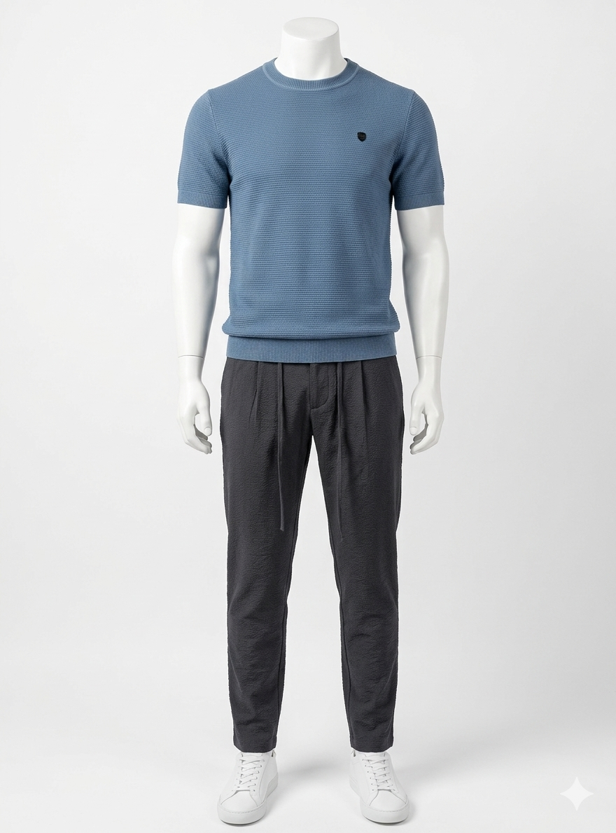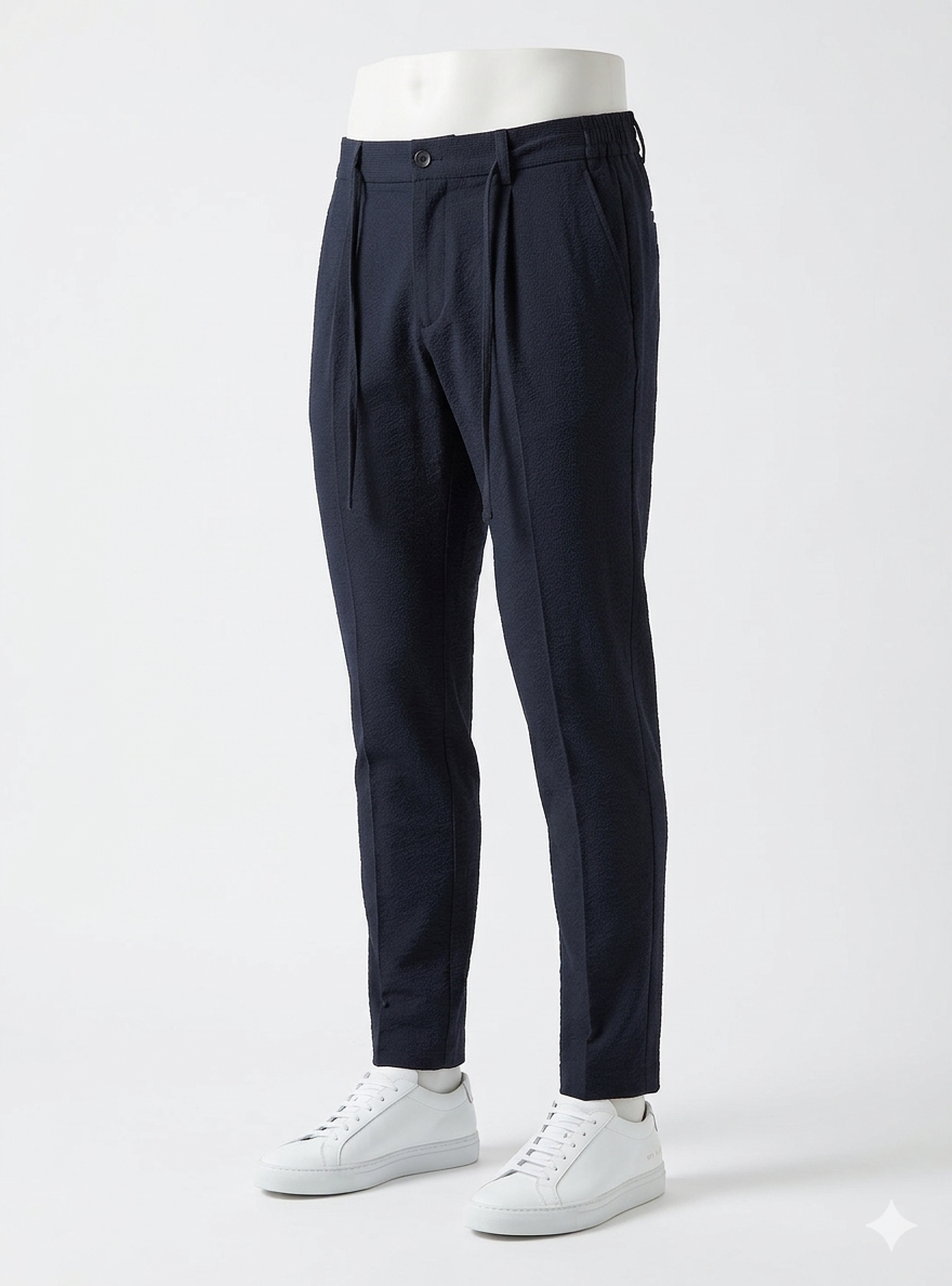 Pantalón de Alexander & Co., 100% poliéster, bolsillo inclinado delante, bolsillo de ojal detrás, semi pitillo, goma y cordón en la cintura, tejido rugoso hacieno raya al tono en color azul marino