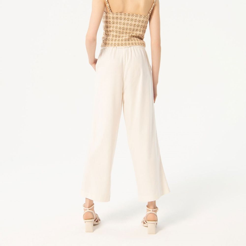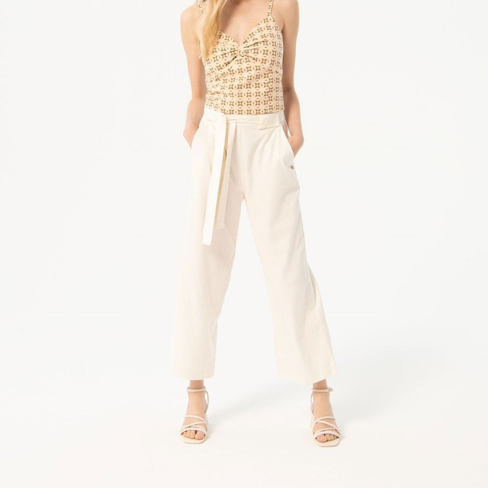 Pantalón de Surkana, 70 % viscosa 30% lino, camal ancho corto, cremallera en lateral izquierdo, goma trasera en cinturilla, dos bolsillos, en color crudo con cinturón al tono